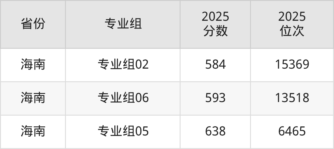 最低分对应地区为北京(01组),录取位次为51312,超本科线14分;最高分对应地区为海南(专业组05),录取位次为6465,超本科线158分。