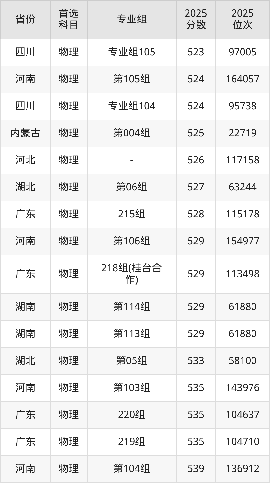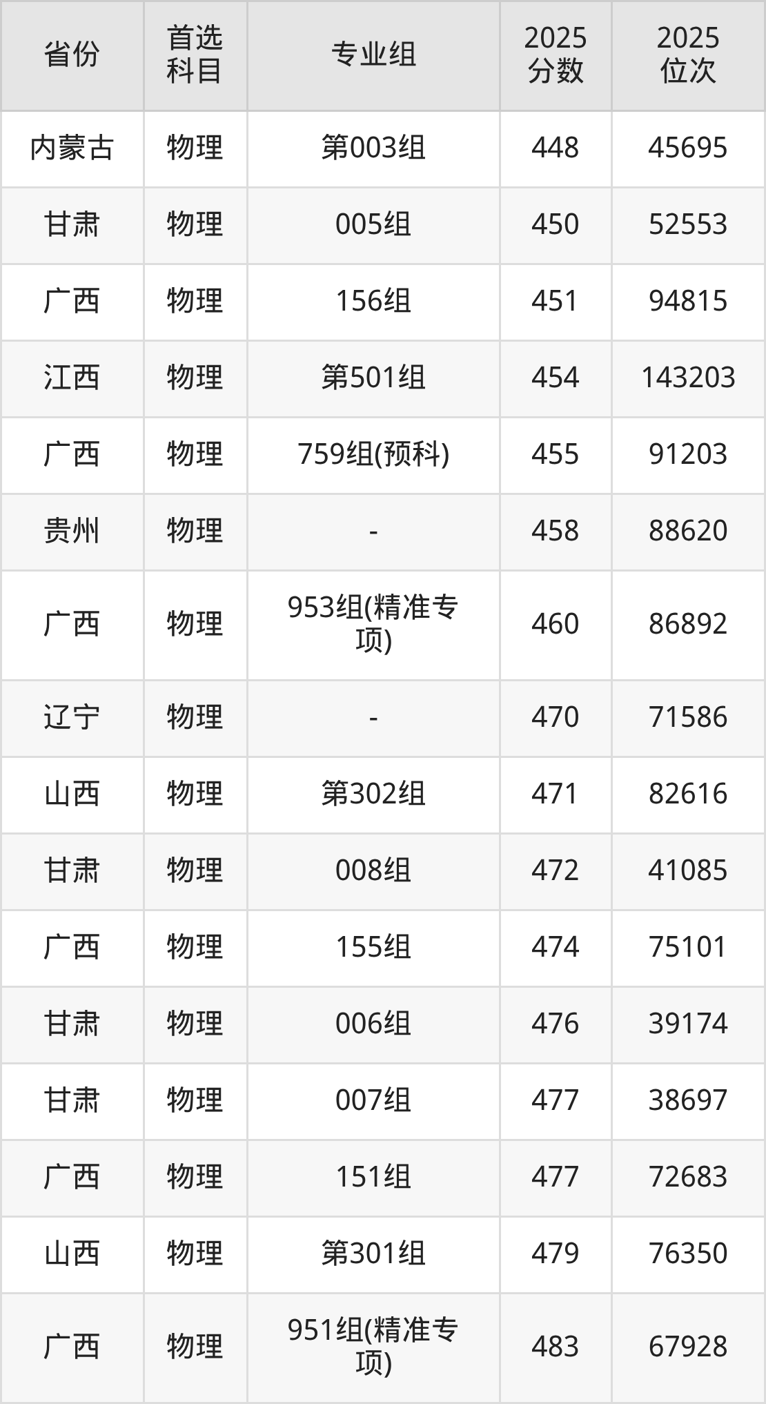 物理类:151组477分、72683名,153组494分、59560名,154组498分、56685名,155组474分、75101名,156组451分、94815名,351组(中外合作)442分、102973名,751组(民族班)510分、48324名,753组(民族班)502分、53827名,754组(民族班)501分、54560名,756组(民族班)503分、53126名,759组(预科)455分、91203名,951组(精准专项)483分、67928名,953组(精准专项)460分、86892名,954组(精准专项)489分、63254名,956组(精准专项)486分、65544名;