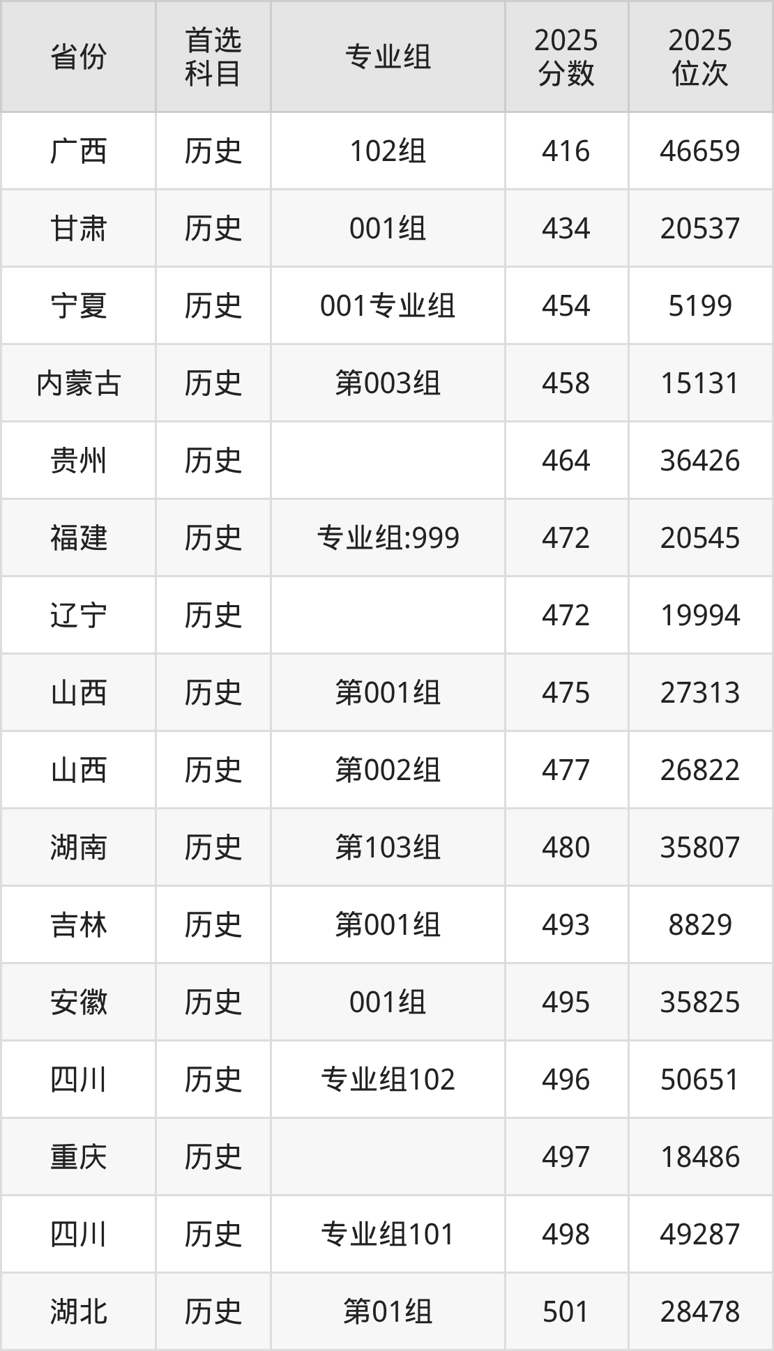 历史类最低分对应地区为广西(102组),录取位次为46659,超本科线14分;最高分对应地区为河北,录取位次为44239,超本科线32分。
