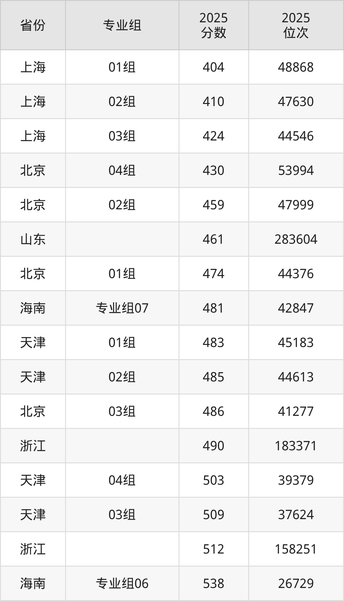 最低分对应地区为上海(01组),录取位次为48868,超本科线2分;最高分对应地区为海南(专业组05),录取位次为24344,超本科线67分。