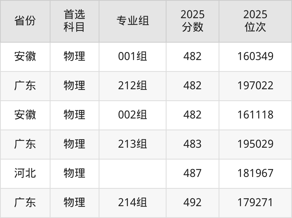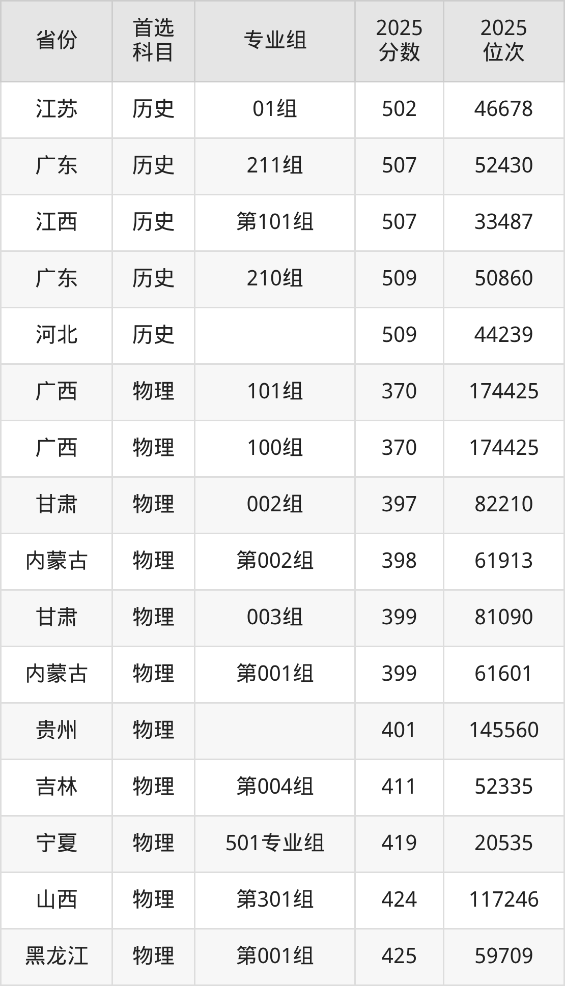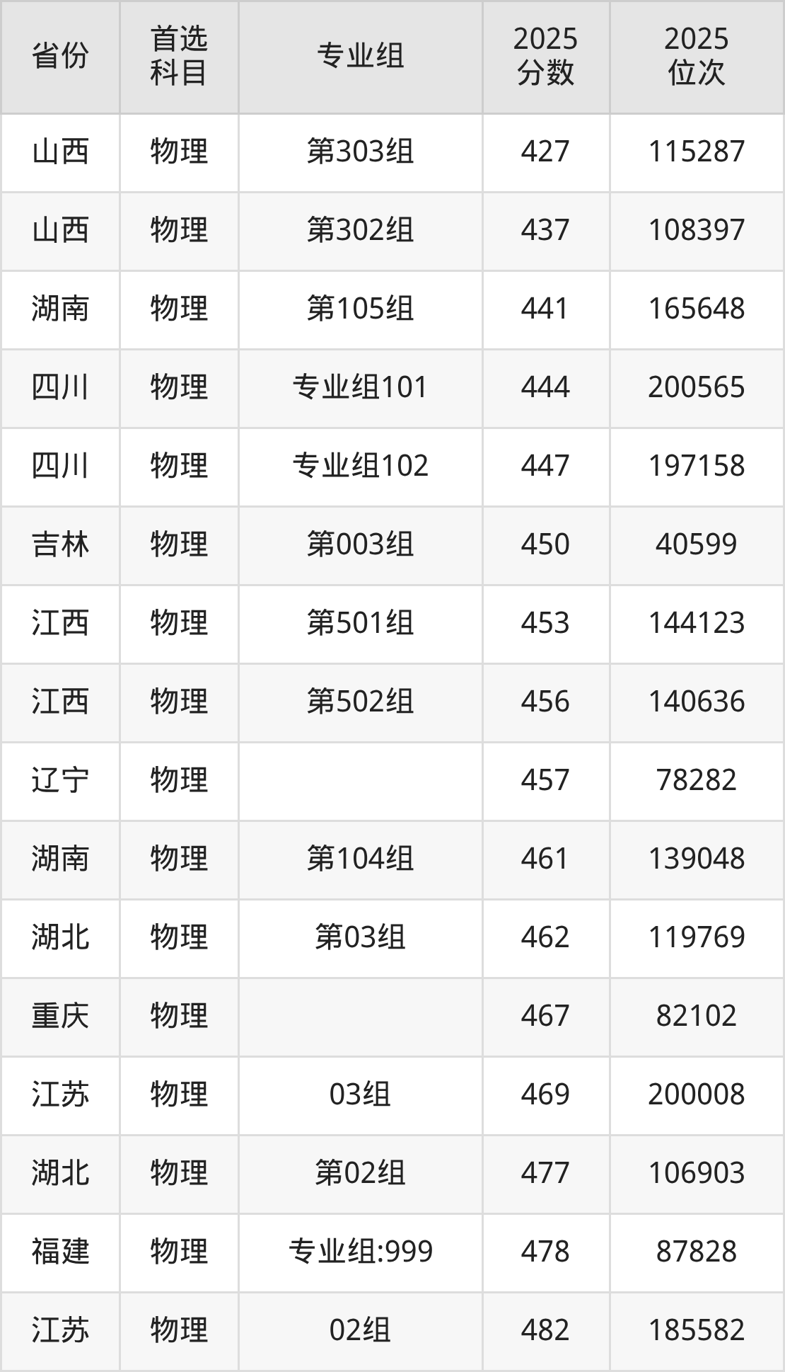物理类最低分对应地区为广西(101组),录取位次为174425;最高分对应地区为广东(214组),录取位次为179271,超本科线56分。