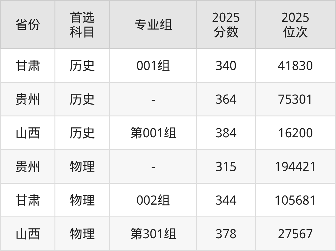 历史类最低分对应地区为甘肃(001组),录取位次为41830;最高分对应地区为山西(第001组),录取位次为16200,超专科线284分。