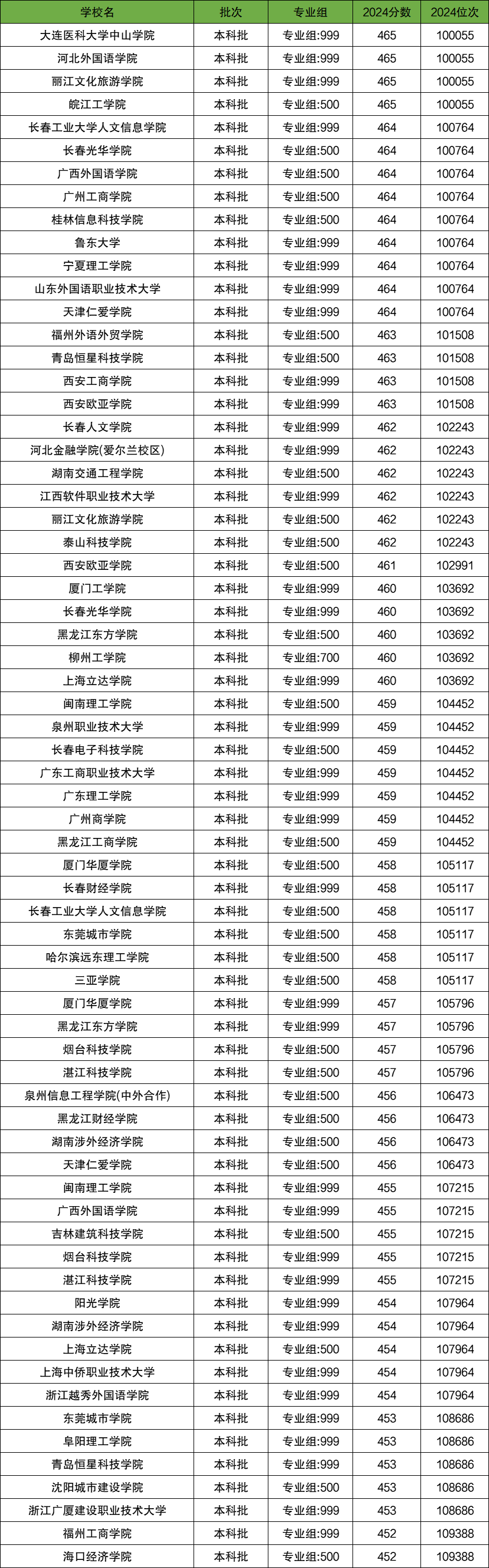1、465分对应位次100055。有大连医科大学中山学院、河北外国语学院、丽江文化旅游学院、皖江工学院。