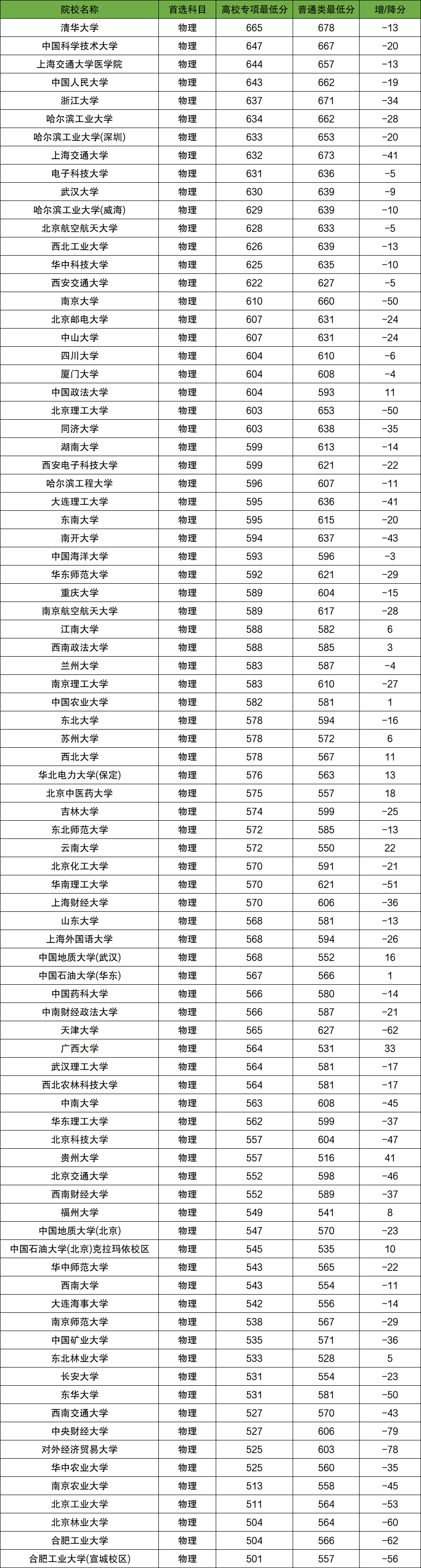同时为了提供一个更为清晰和便捷的参考,老师仅对各大学所有高校专项计划专业中的最低录取分数线进行了汇总,来参与增、降分的对比。