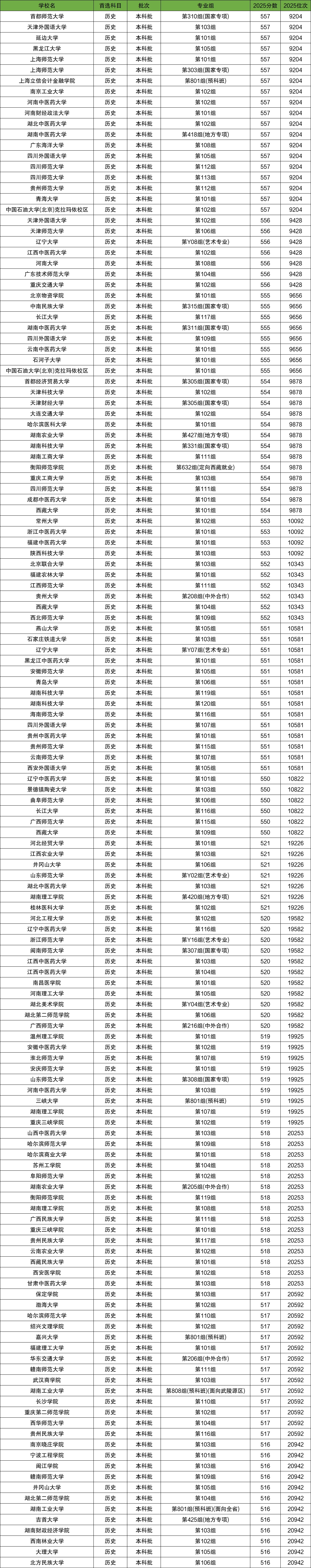2025年全国大学历史类在湖南本科录取最低位次范围为55名以内~69977名,其中: