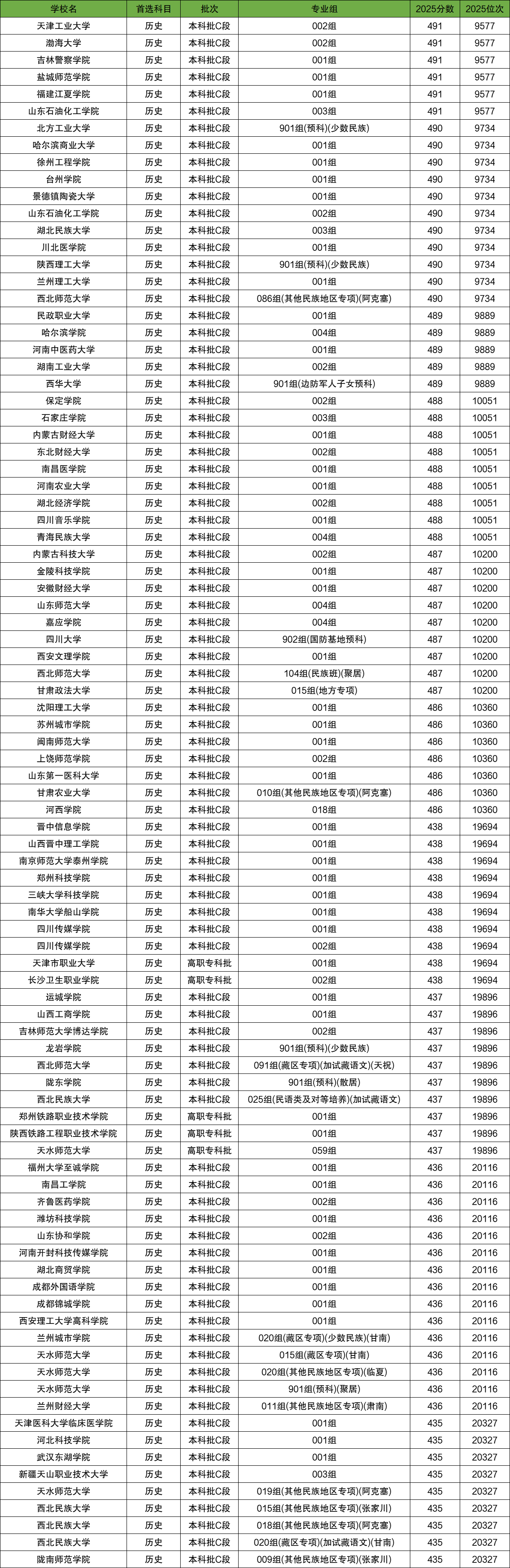 2025年全国大学历史类在甘肃本科录取最低位次范围为36名以内~56978名,其中: