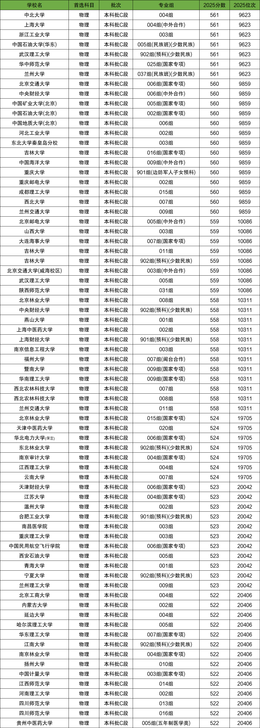 2025年全国大学物理类在甘肃本科录取最低位次范围为44名~120677名,其中: