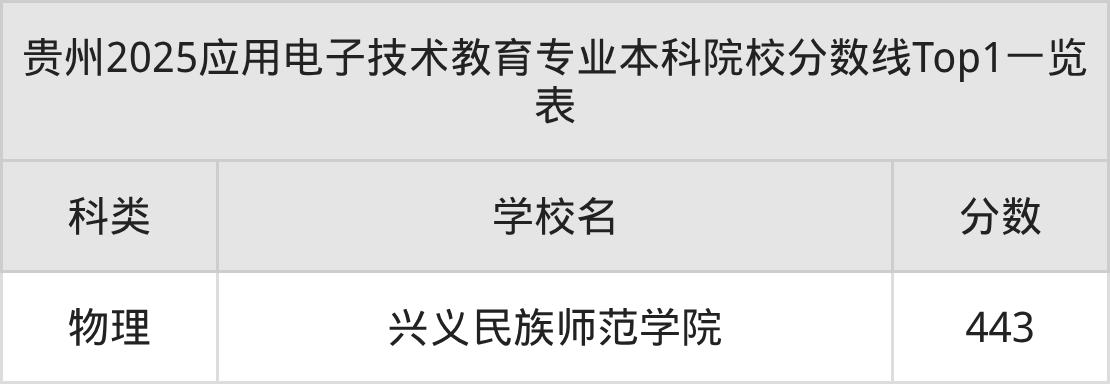 全国本科院校应用电子技术教育专业物理类最低收分为443分,对应的招生院校是兴义民族师范学院。