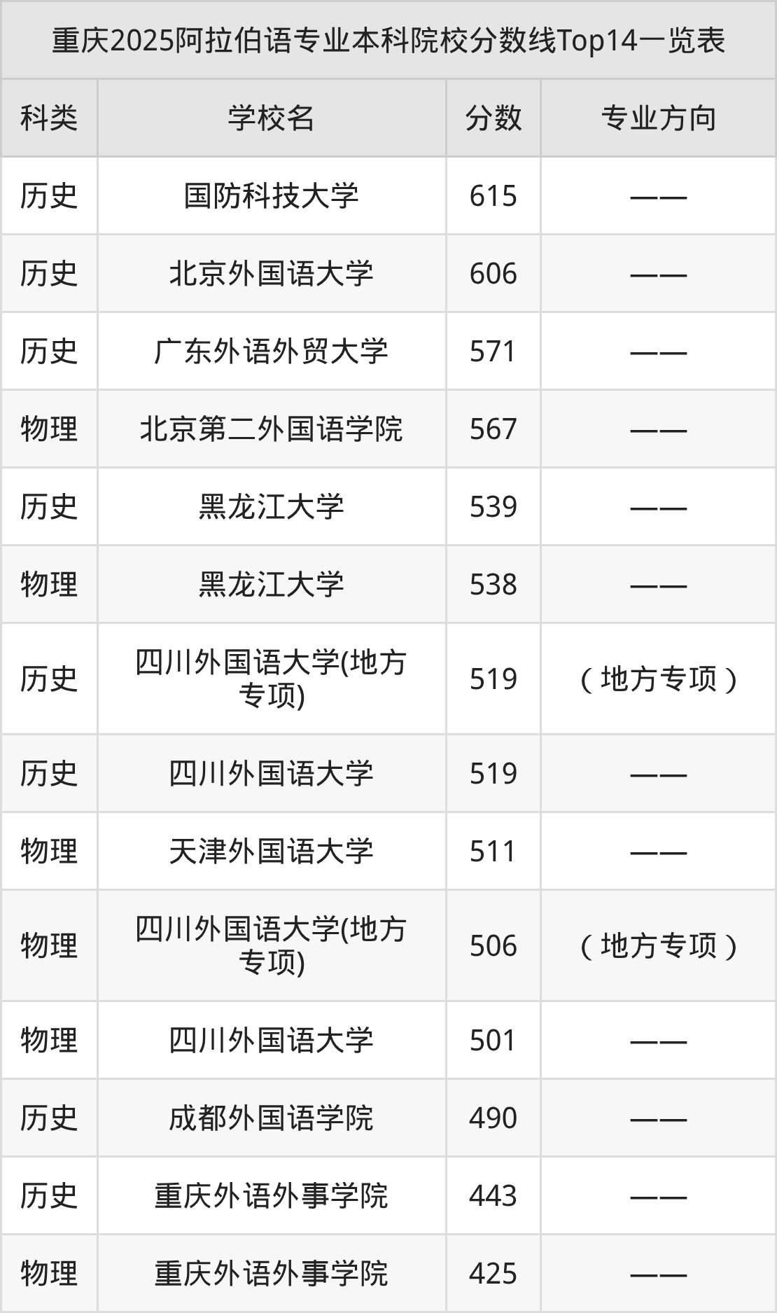 阿拉伯语专业本科院校实力排名靠前的有北京大学、北京外国语大学、上海外国语大学等。2025年本科阿拉伯语专业招生最低分数为425分(物理类),而想报考该专业的历史类考生分数至少要在443分以上。