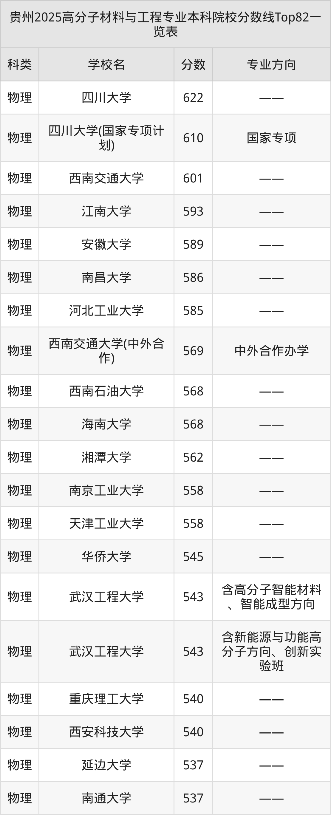 高分子材料与工程专业本科院校实力排名靠前的有四川大学、浙江大学、中国科学技术大学等。2025年本科高分子材料与工程专业招生最低分数为399分(物理类)。