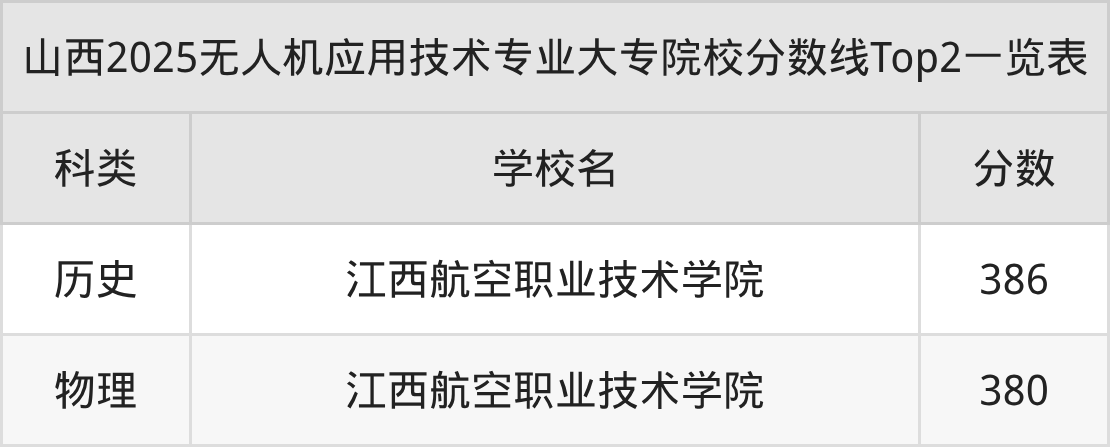 物理类最低收分为380分,对应的招生院校是江西航空职业技术学院。结合上述分析,物理类考生比历史类考生更容易上无人机应用技术大专院校。