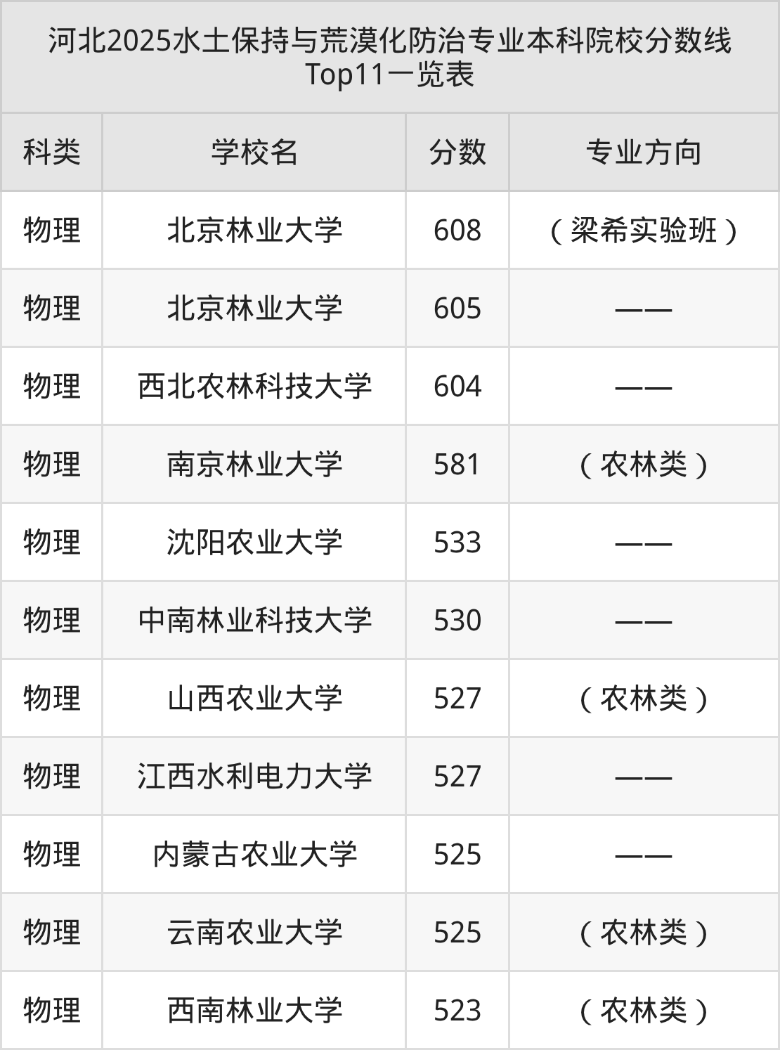 水土保持与荒漠化防治专业本科院校实力排名靠前的有北京林业大学、西北农林科技大学、南京林业大学等。2025年本科水土保持与荒漠化防治专业招生最低分数为523分(物理类)。