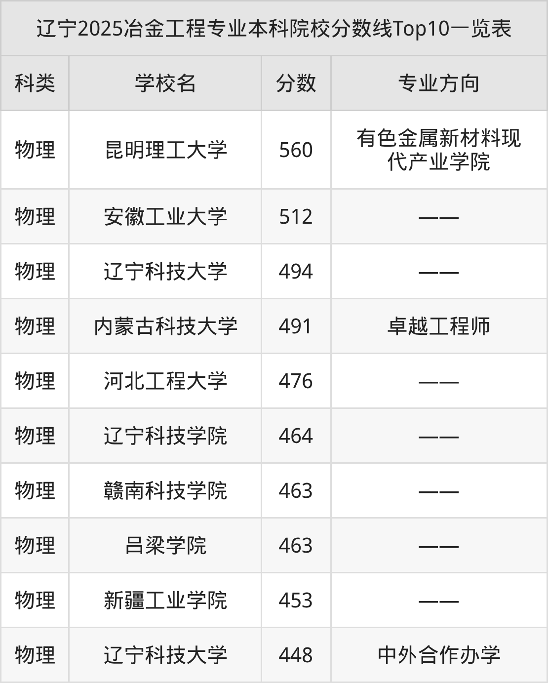 冶金工程专业本科院校实力排名靠前的有中南大学、北京科技大学、东北大学等。2025年本科冶金工程专业招生最低分数为448分(物理类)。