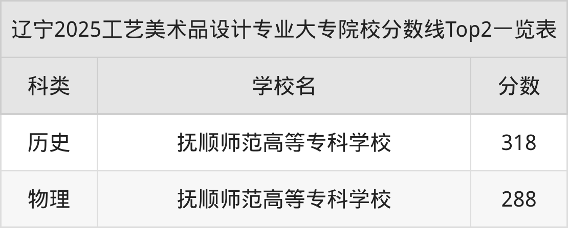 物理类最低收分为288分,对应的招生院校是抚顺师范高等专科学校。结合上述分析,物理类考生比历史类考生更容易上工艺美术品设计大专院校。