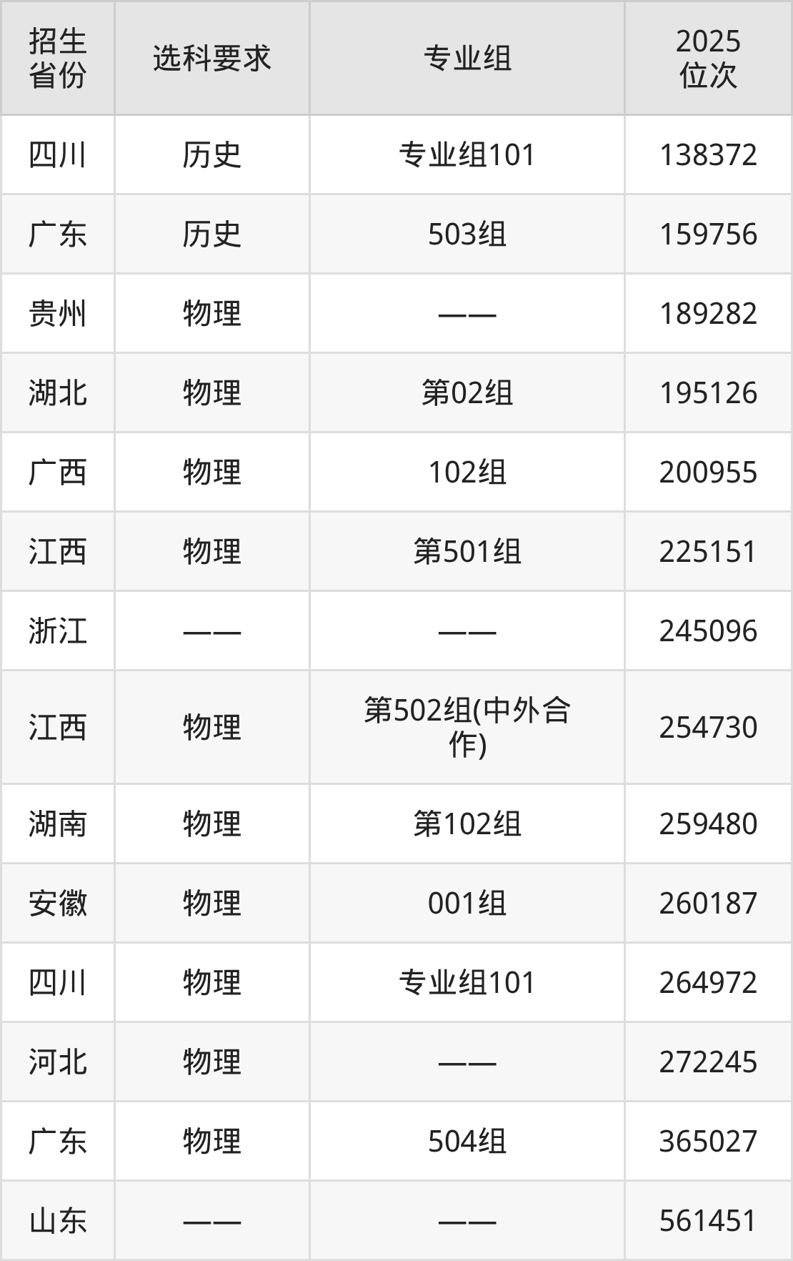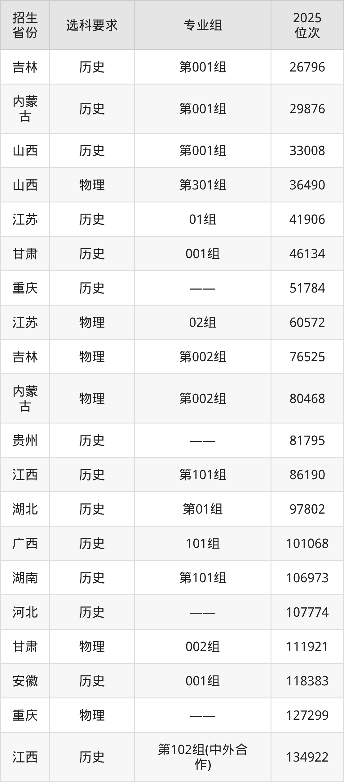 江西环境工程职业学院2025年在全国各省的位次差异较大,最高位次是26796位(吉林历史类)、最低位次是561451位(山东)。各省具体位次请看下图: