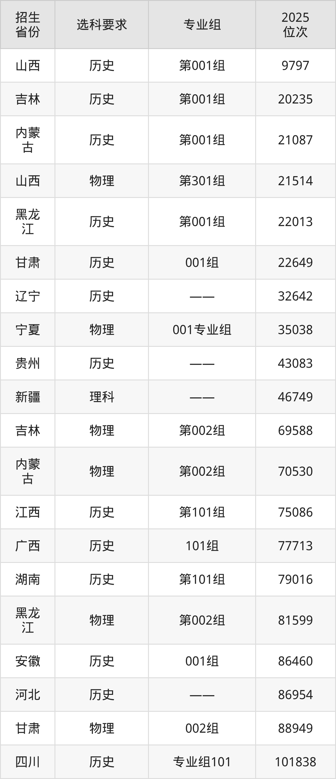 辽宁医药职业学院2025年在全国各省的位次差异较大,最高位次是9797位(山西历史类)、最低位次是256432位(四川物理类)。各省具体位次请看下图: