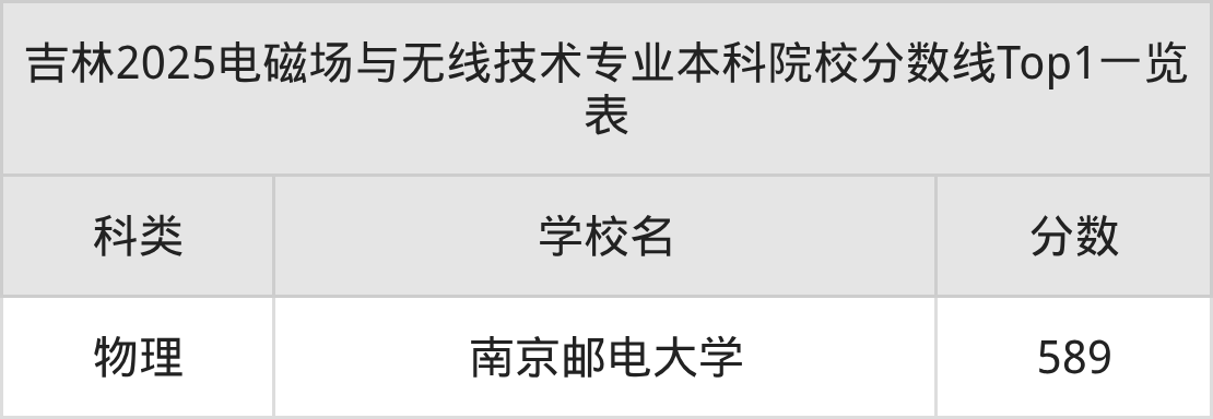 全国本科院校电磁场与无线技术专业物理类最低收分为589分,对应的招生院校是南京邮电大学。