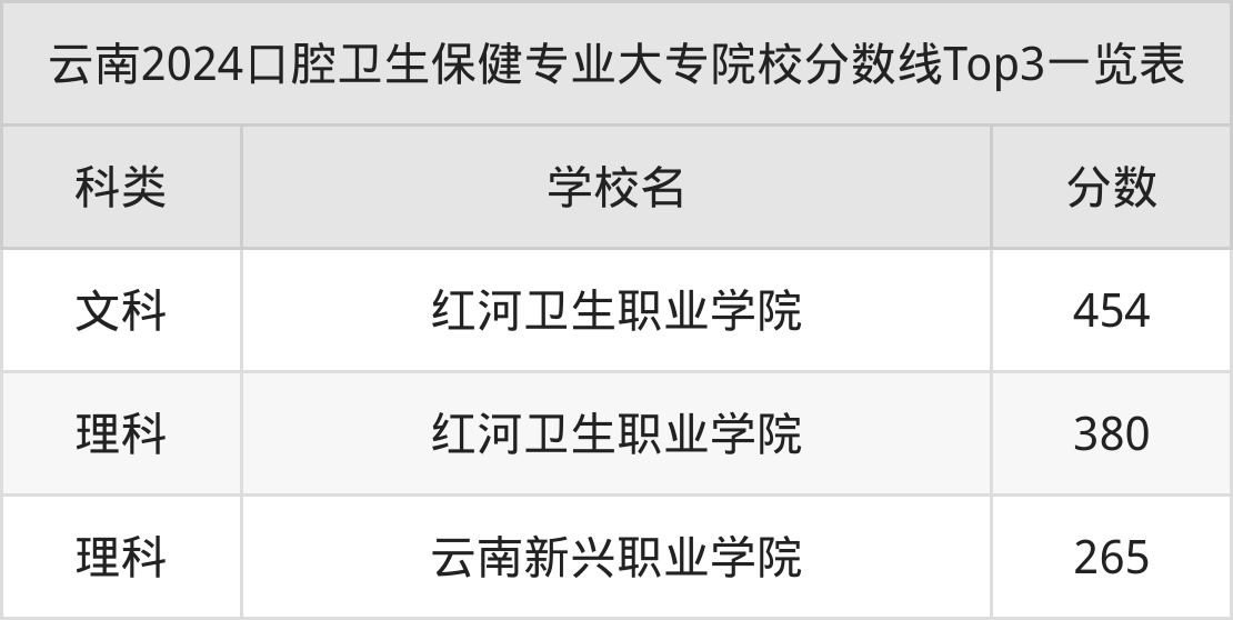 理科最低收分范围在265分~380分之间,其中最低分院校是云南新兴职业学院,最高分院校是红河卫生职业学院。结合上述分析,理科考生比文科考生更容易上口腔卫生保健大专院校。