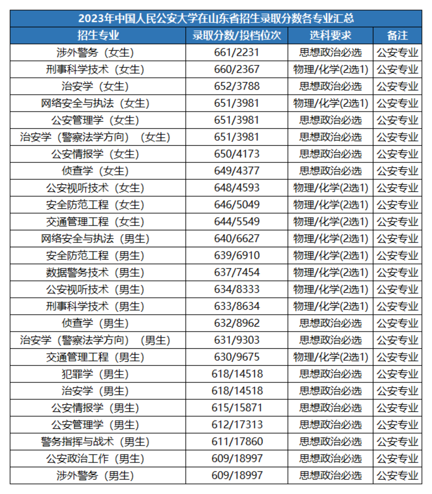 整体来看,公安大学2023年在山东招录男生的最低公安专业为涉外警务和公安政治工作,录取分数均为609分;招录女生的最低公安专业为交通管理工程,投档分数为644分。
