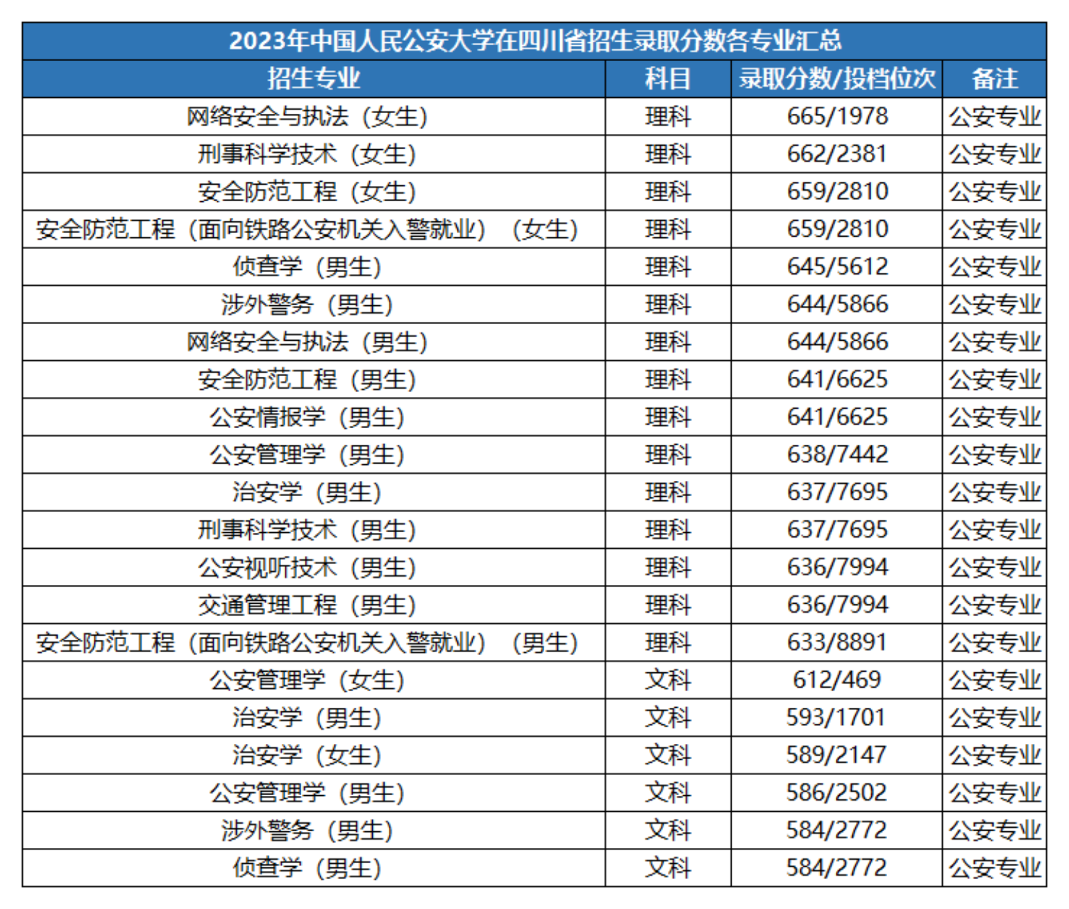 学校面向四川文科招生的公安专业数量相较于理科来说明显少了不少,其中面向女生招生的公安专业仅有公安管理学和治安学两个专业,录取分数分别为612分和589分;而公安大学在男生中录取分数最低的公安专业也有两个,分别是涉外警务和侦查学专业,投档录取分数均为584分。