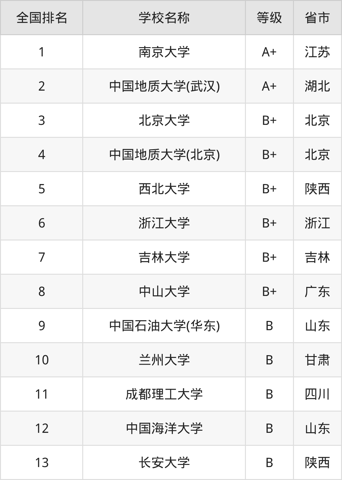 全国地质学开设院校参与排名的共有13所,实力最强的是南京大学(全国排名第1名),其专业实力等级被评为A+级。