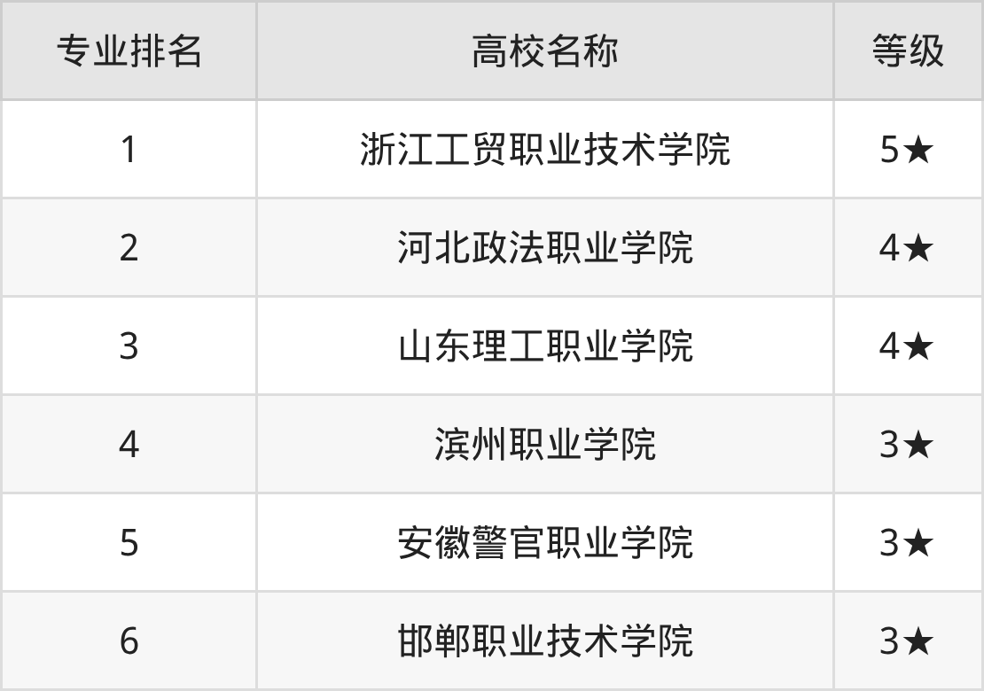 全国知识产权管理开设院校参与排名的共有6所,实力最强的是浙江工贸职业技术学院(全国排名第1名),其专业实力等级被评为5★级。