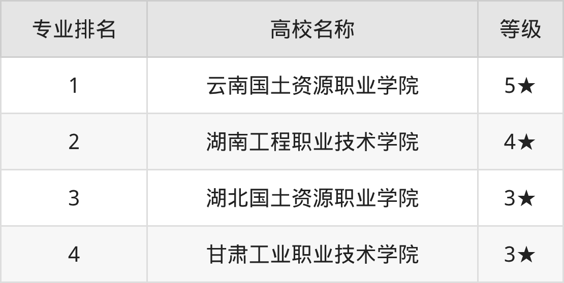 全国地质调查与矿产普查开设院校参与排名的共有4所,实力最强的是云南国土资源职业学院(全国排名第1名),其专业实力等级被评为5★级。