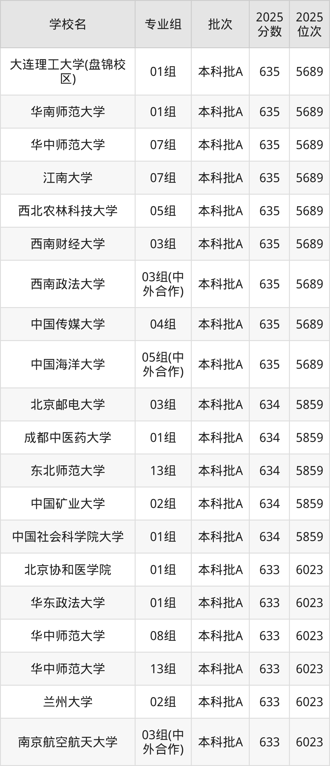 2025年在天津高考录取分数线是633分的大学一共有10所,分别是北京协和医学院、华东政法大学、华中师范大学、兰州大学、南京航空航天大学、陕西师范大学、上海大学、西南财经大学、西南大学、西南交通大学。