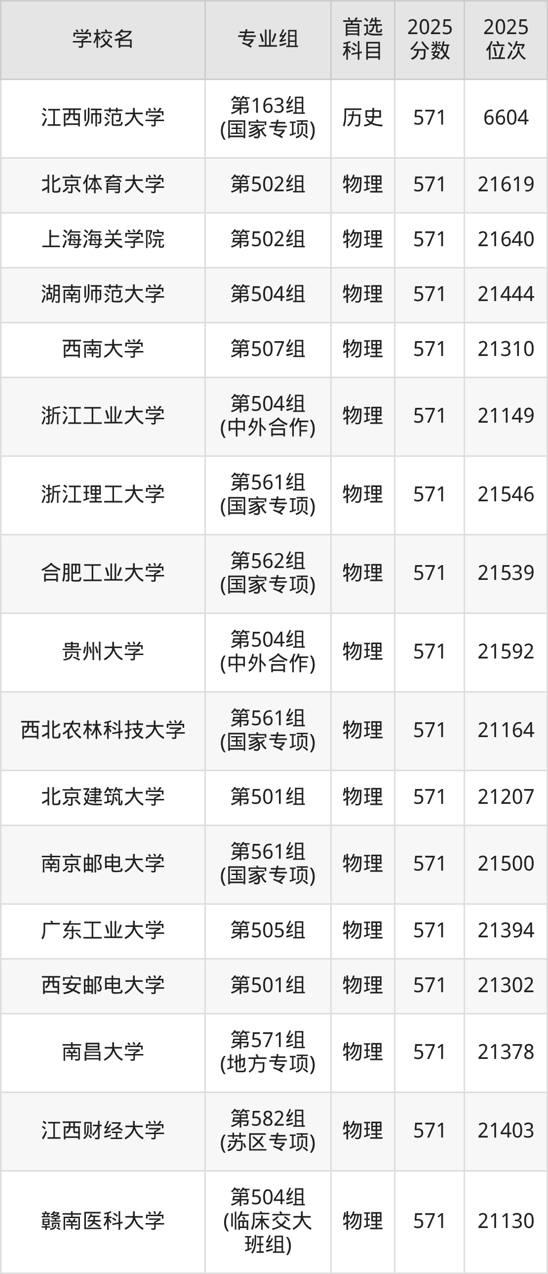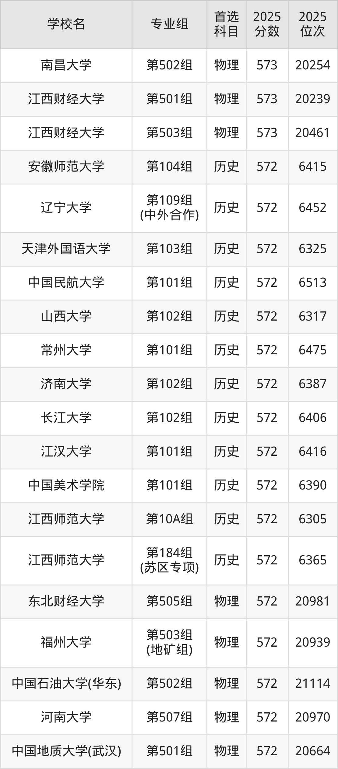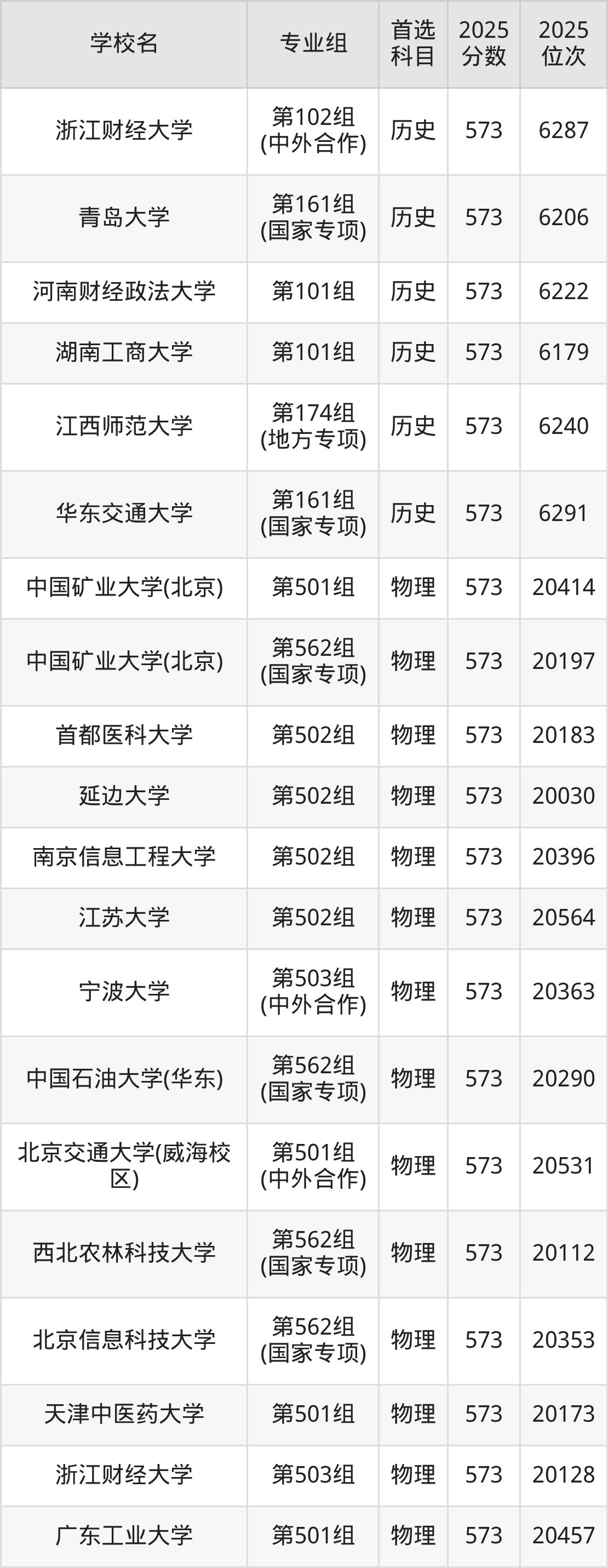 江西高考历史类573分对应的位次排名是6114名-6291名,物理类573分对应的位次排名是20030名-20564名,因此建议2026年位次排在这附近的同学考虑这些大学。