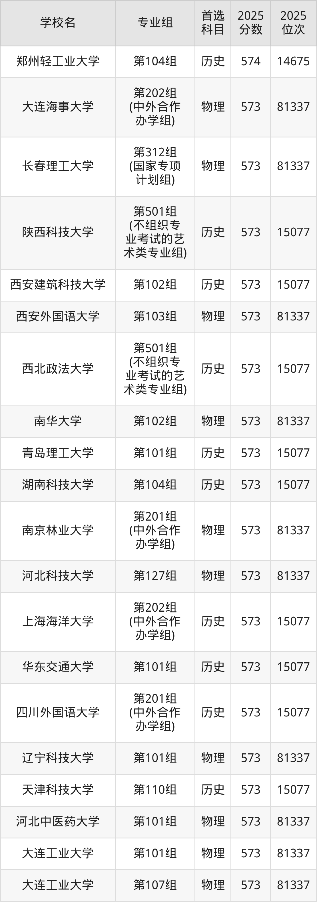 2025年在河南高考物理类录取分数线是573分的大学有大连海事大学、长春理工大学、西安外国语大学、南华大学、南京林业大学、河北科技大学、辽宁科技大学、河北中医药大学、大连工业大学、辽宁中医药大学等。历史类录取分数线是573分的大学有陕西科技大学、西安建筑科技大学、西北政法大学、青岛理工大学、湖南科技大学、上海海洋大学、华东交通大学、四川外国语大学、天津科技大学、江西科技师范大学等。