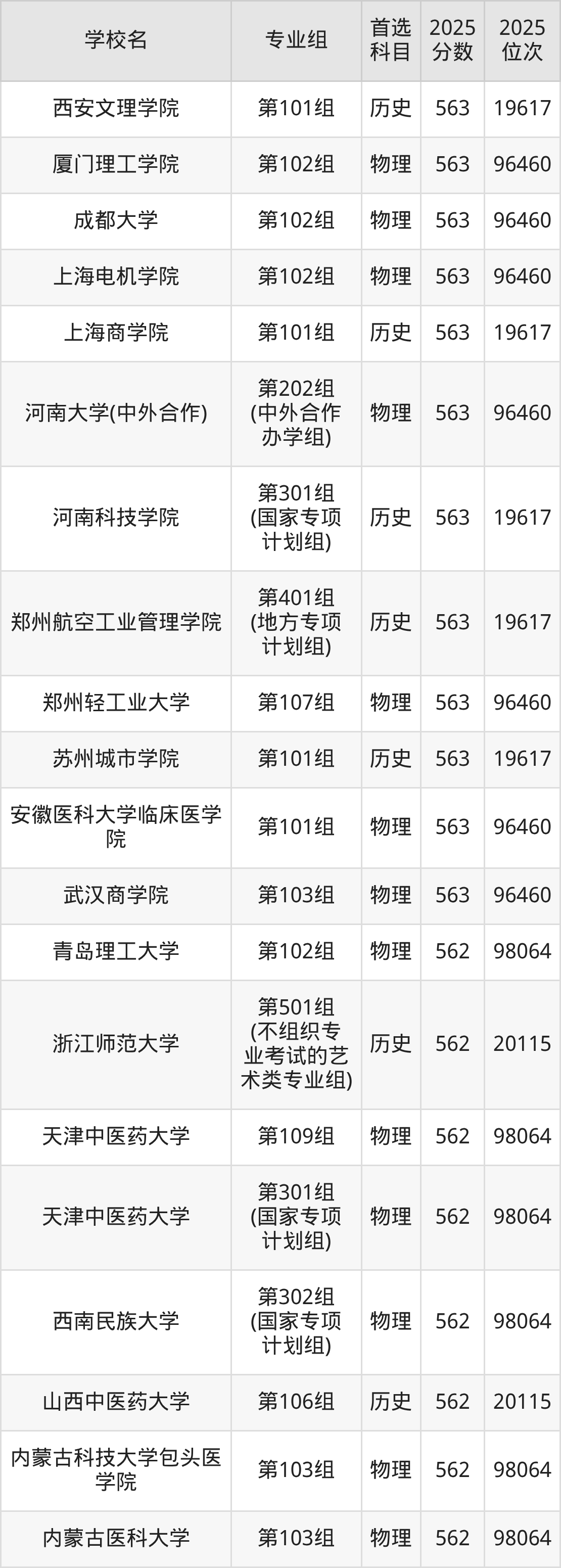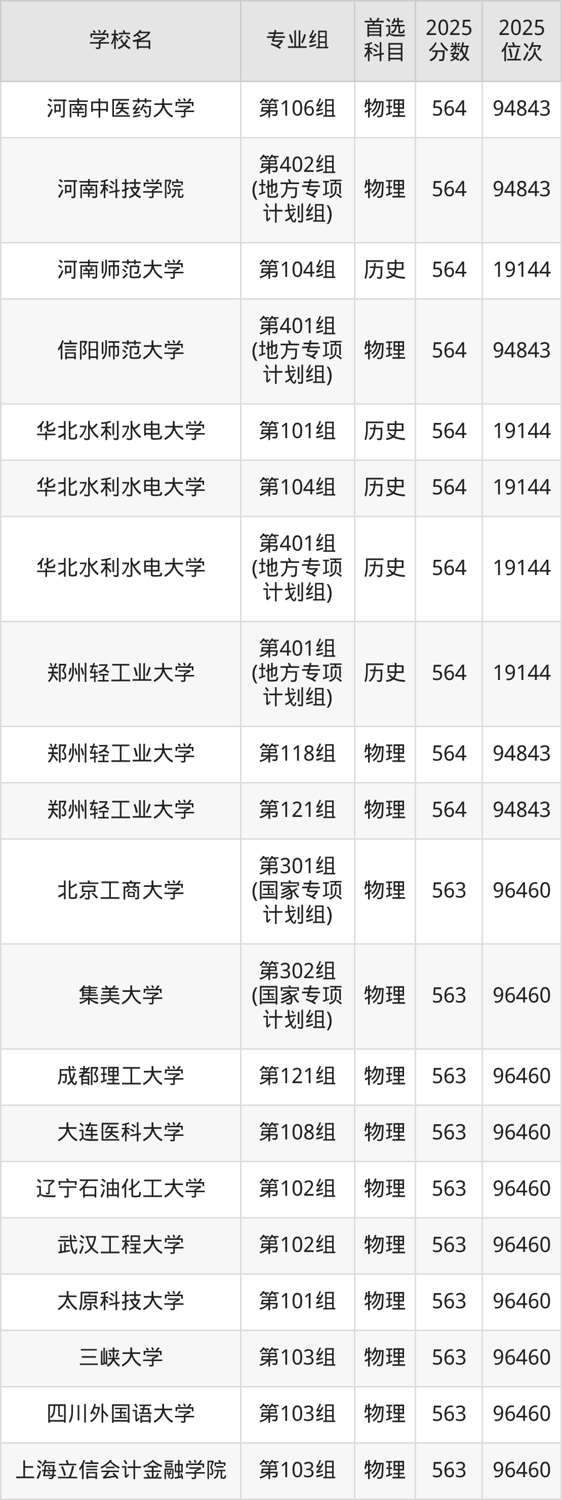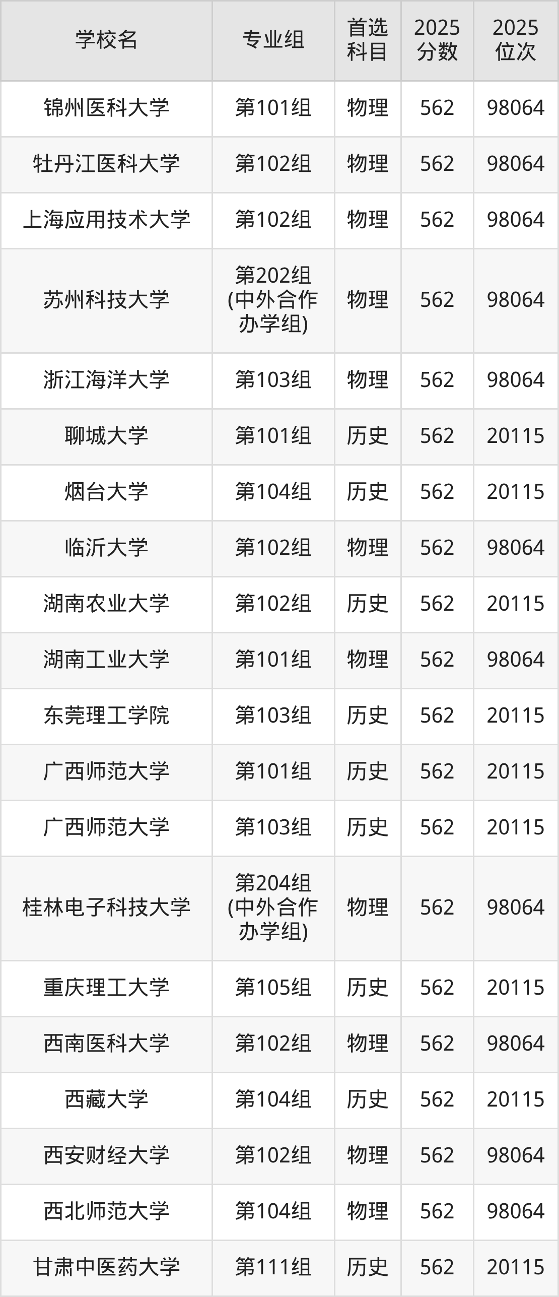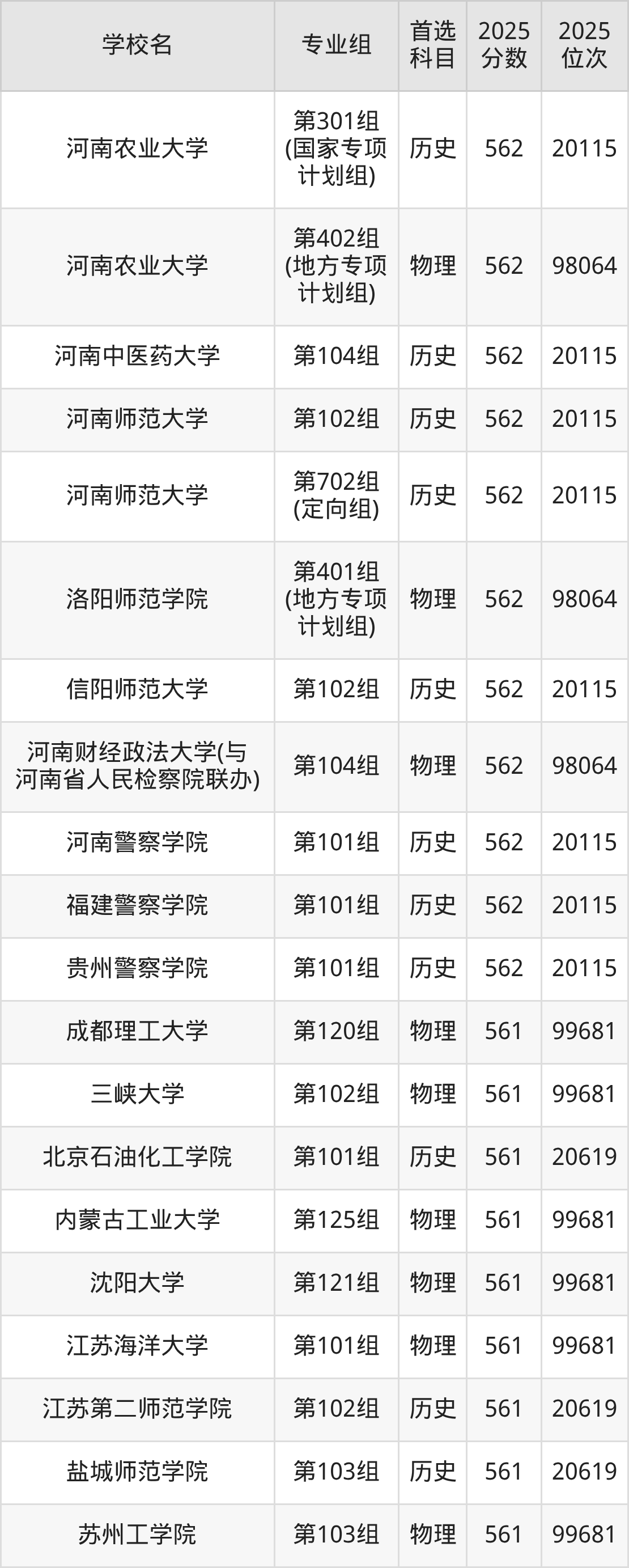 河南高考物理类562分对应的位次排名是98064名,历史类562分对应的位次排名是20115名,因此建议2026年位次排在这附近的同学考虑这些大学。