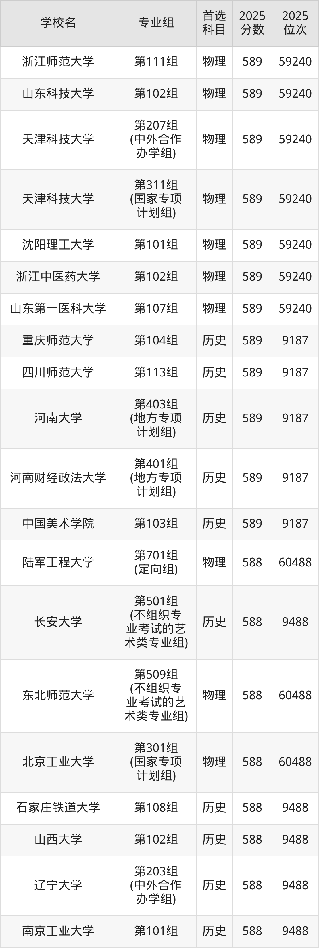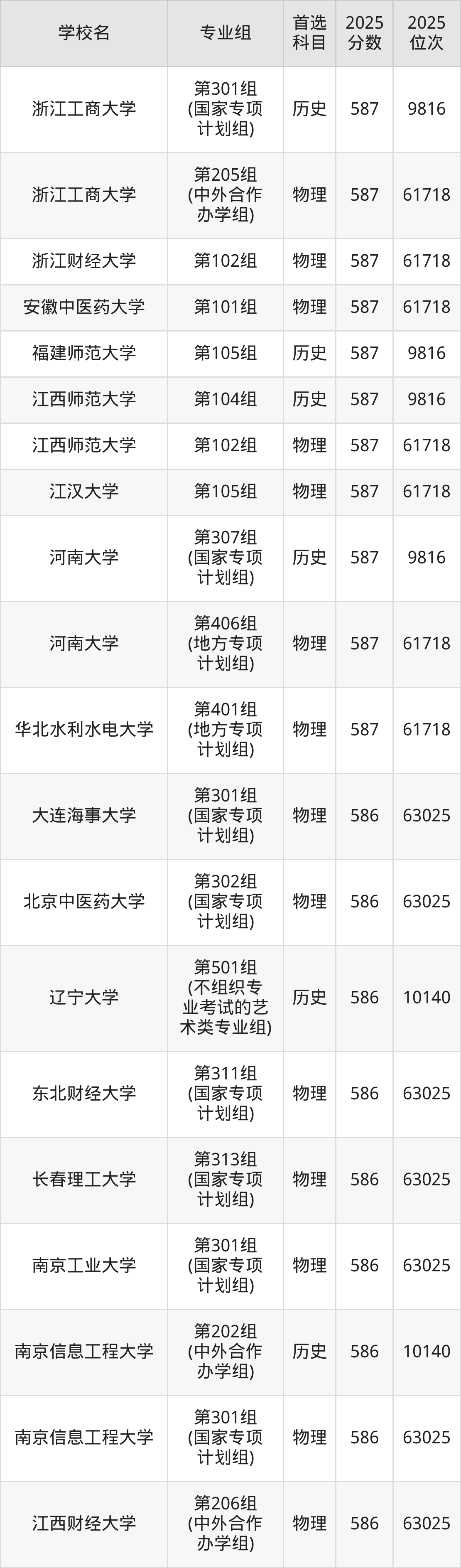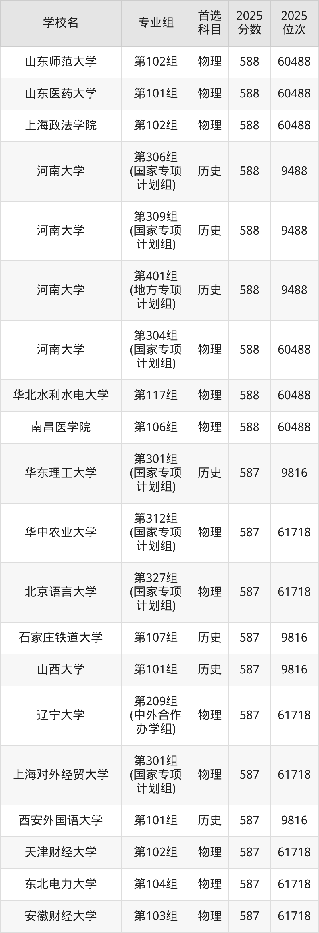 2025年在河南高考历史类录取分数线是587分的大学有华东理工大学、石家庄铁道大学、山西大学、西安外国语大学、成都理工大学、黑龙江中医药大学、河北大学、上海电力大学、温州大学、浙江工商大学等。物理类录取分数线是587分的大学有华中农业大学、北京语言大学、辽宁大学、上海对外经贸大学、天津财经大学、东北电力大学、安徽财经大学、南昌航空大学、成都理工大学、南京林业大学等。