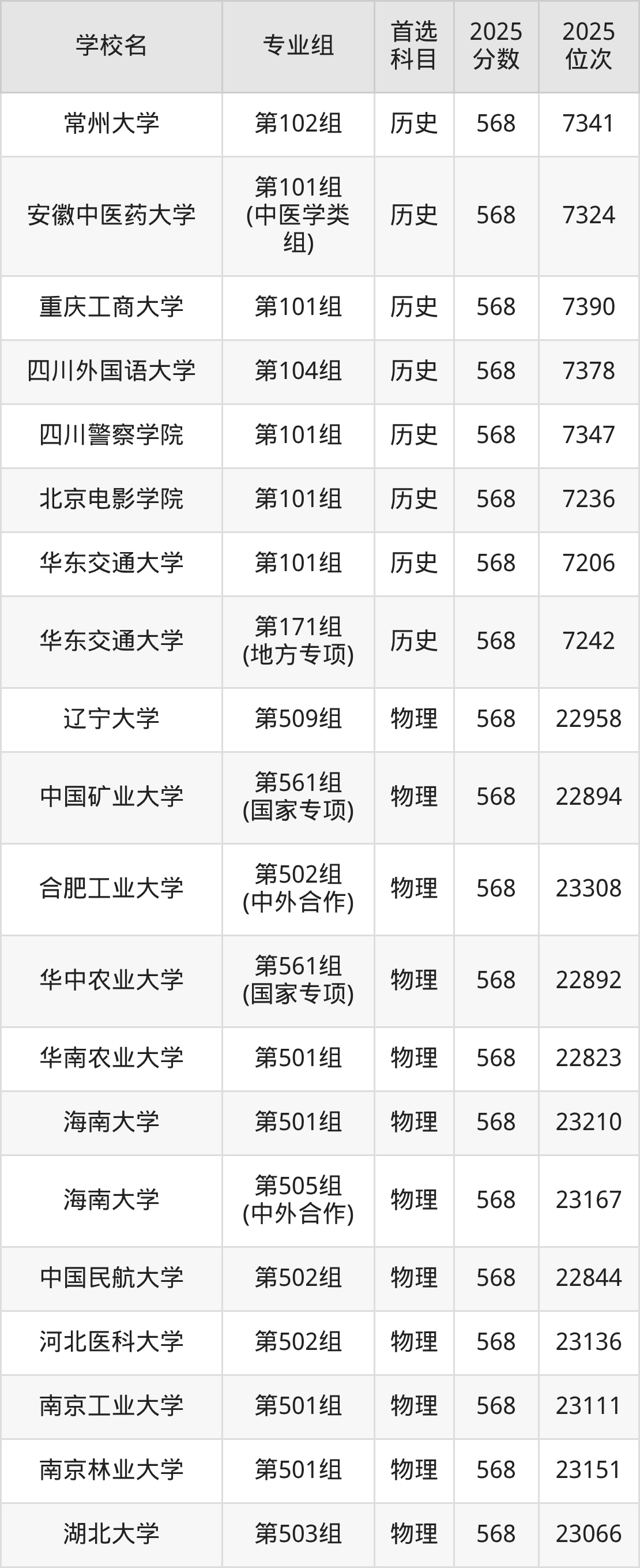 江西高考历史类568分对应的位次排名是7206名-7390名,物理类568分对应的位次排名是22823名-23308名,因此建议2026年位次排在这附近的同学考虑这些大学。