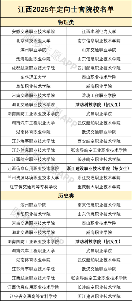 最新一年招生计划显示,定向士官在江西省招生院校共计36所,不同院校招生人数、专业、类型等都有差异,为方便2026届考生报考,下面将详细列举这些学校的名单,供查阅: