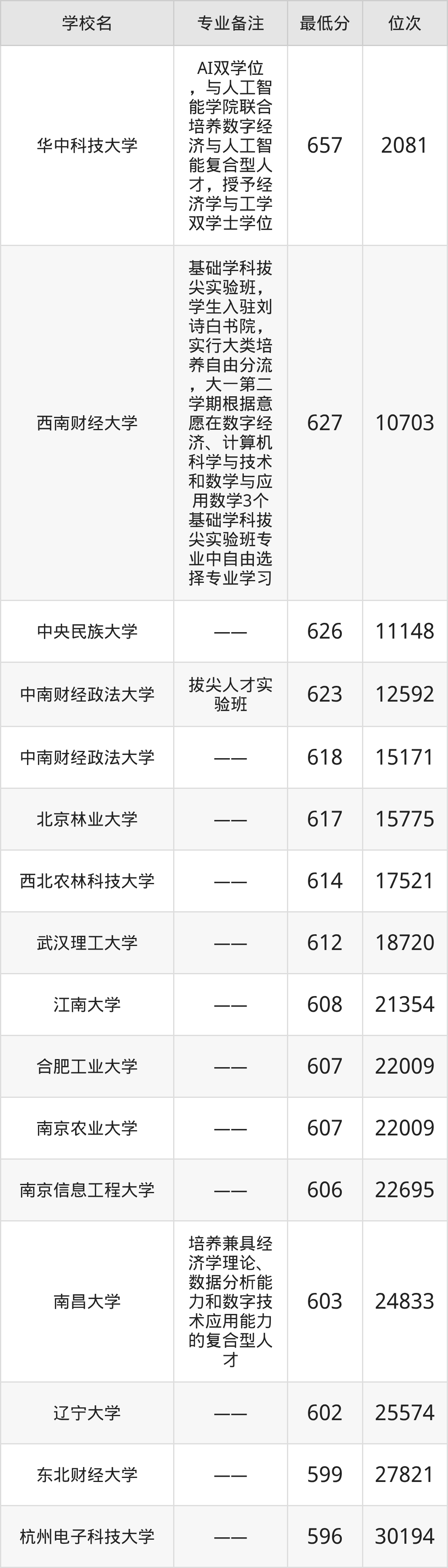 数字经济分数线排名前五的院校分别是:657分的华中科技大学(AI双学位,与人工智能学院联合培养数字经济与人工智能复合型人才,授予经济学与工学双学士学位)、627分的西南财经大学(基础学科拔尖实验班,学生入驻刘诗白书院,实行大类培养自由分流,大一第二学期根据意愿在数字经济、计算机科学与技术和数学与应用数学3个基础学科拔尖实验班专业中自由选择专业学习)、626分的中央民族大学、623分的中南财经政法大学(拔尖人才实验班)、617分的北京林业大学。