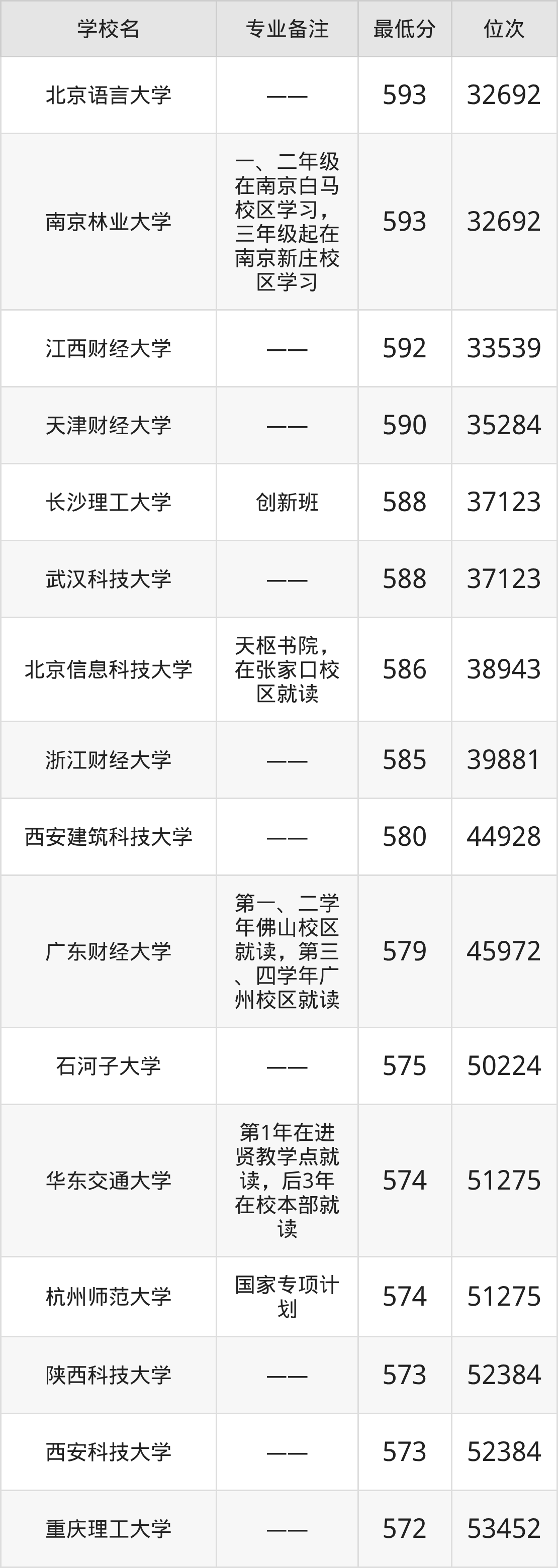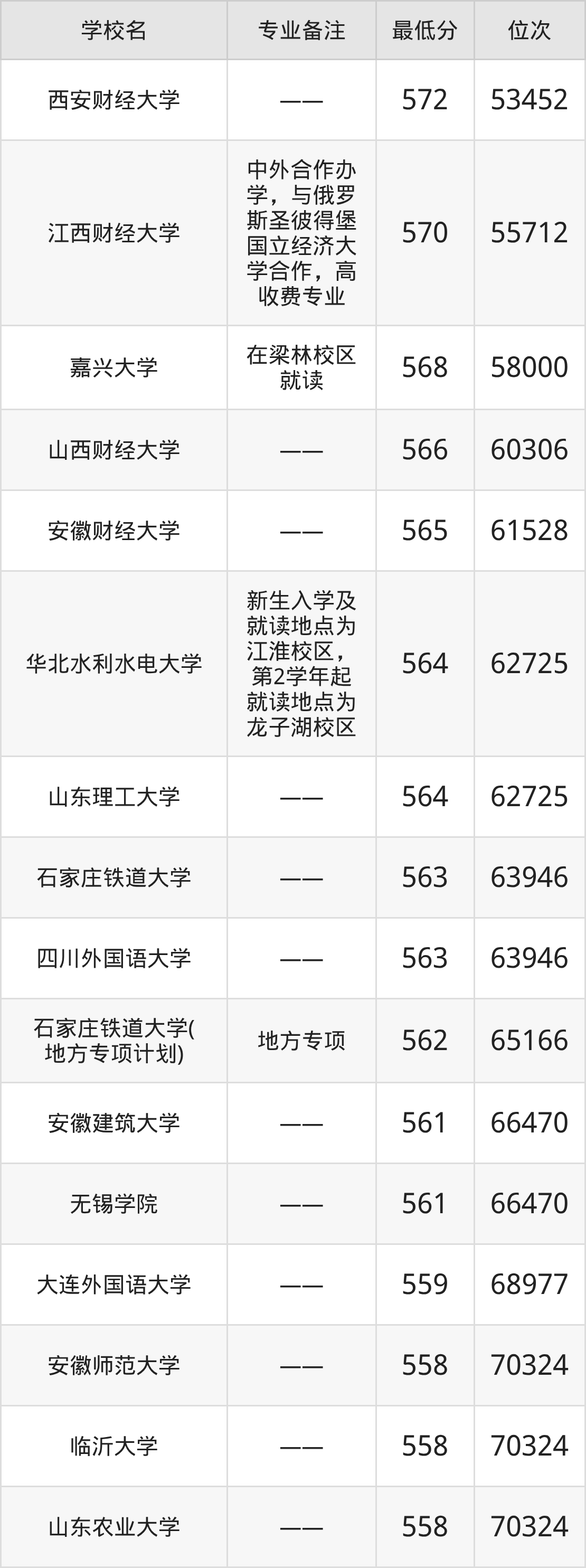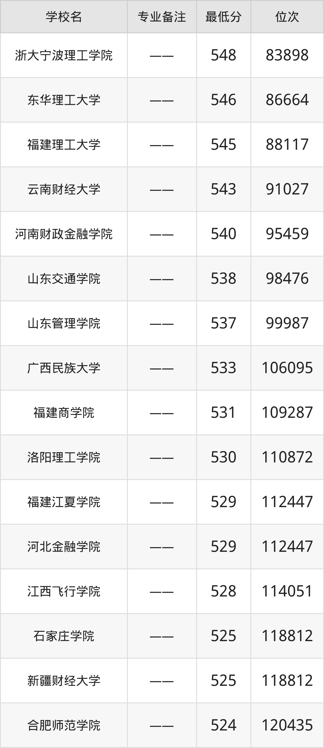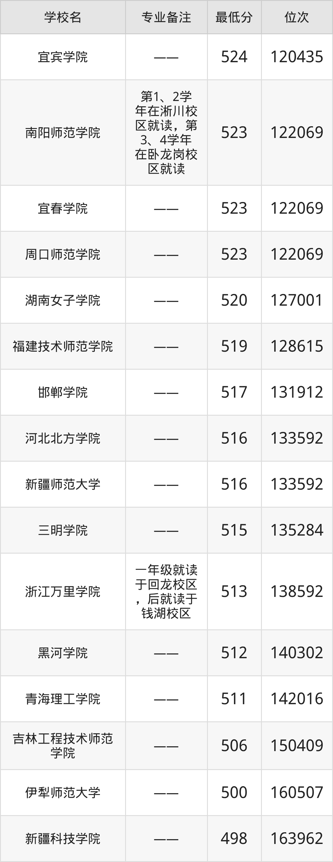 分数线低于520分能上的数字经济大学还有黑河学院(512分)、青海理工学院(511分)、吉林工程技术师范学院(506分)、伊犁师范大学(500分)。