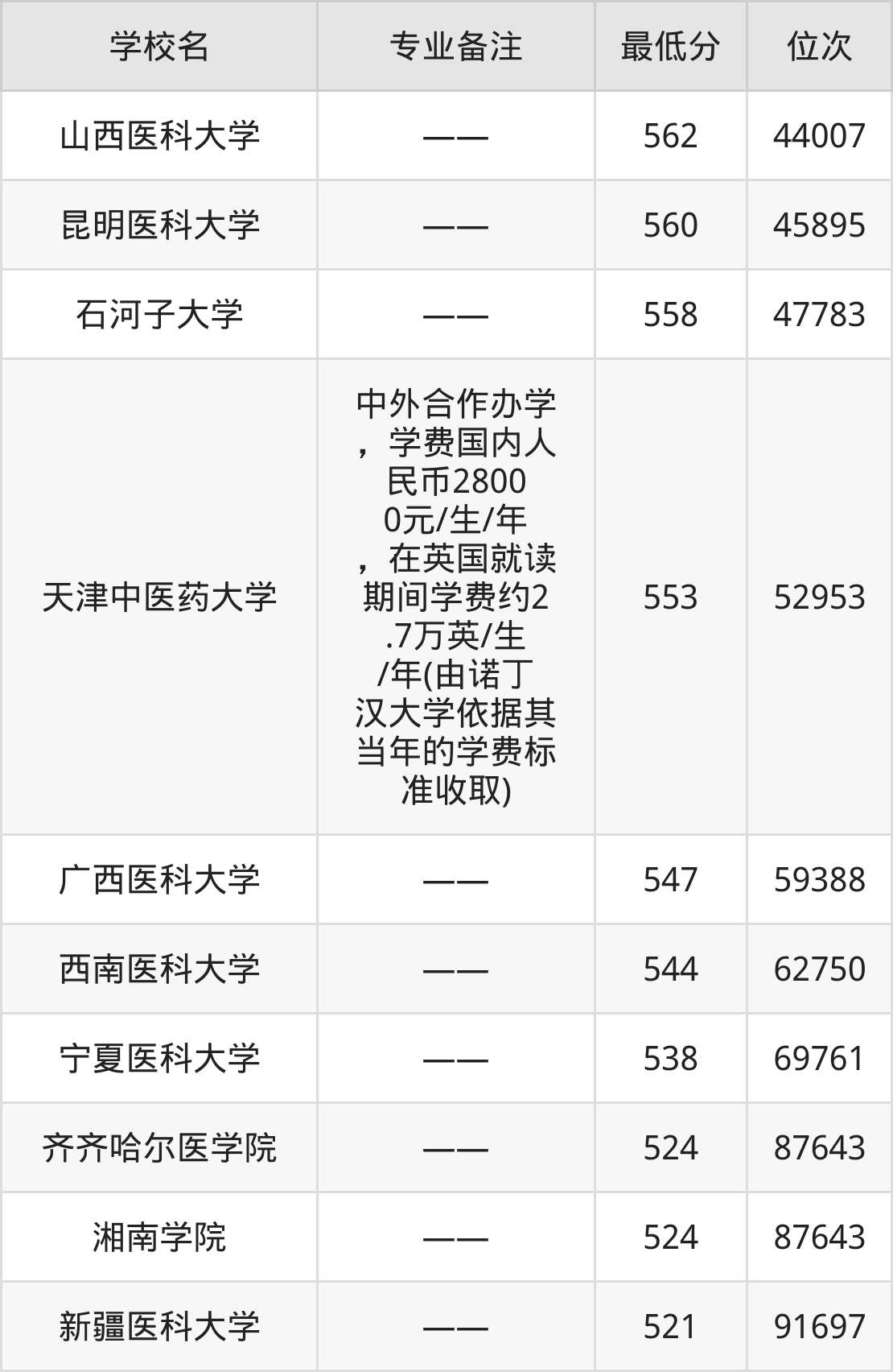 分数线低于550分能上的临床药学大学还有西南医科大学(544分)、宁夏医科大学(538分)、齐齐哈尔医学院(524分)、湘南学院(524分)。