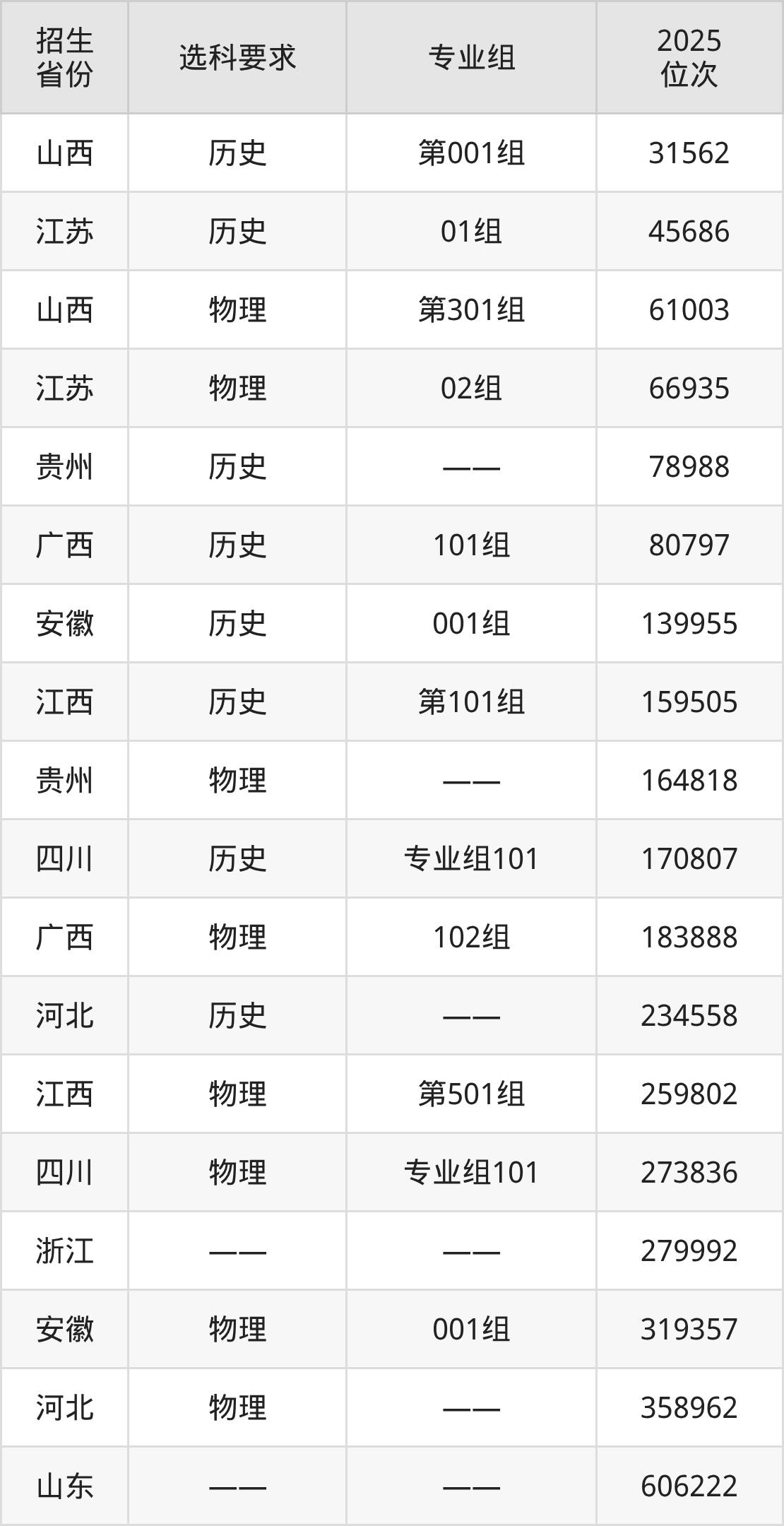 无锡南洋职业技术学院2025年在全国各省的位次差异较大,最高位次是31562位(山西历史类)、最低位次是606222位(山东)。各省具体位次请看下图: