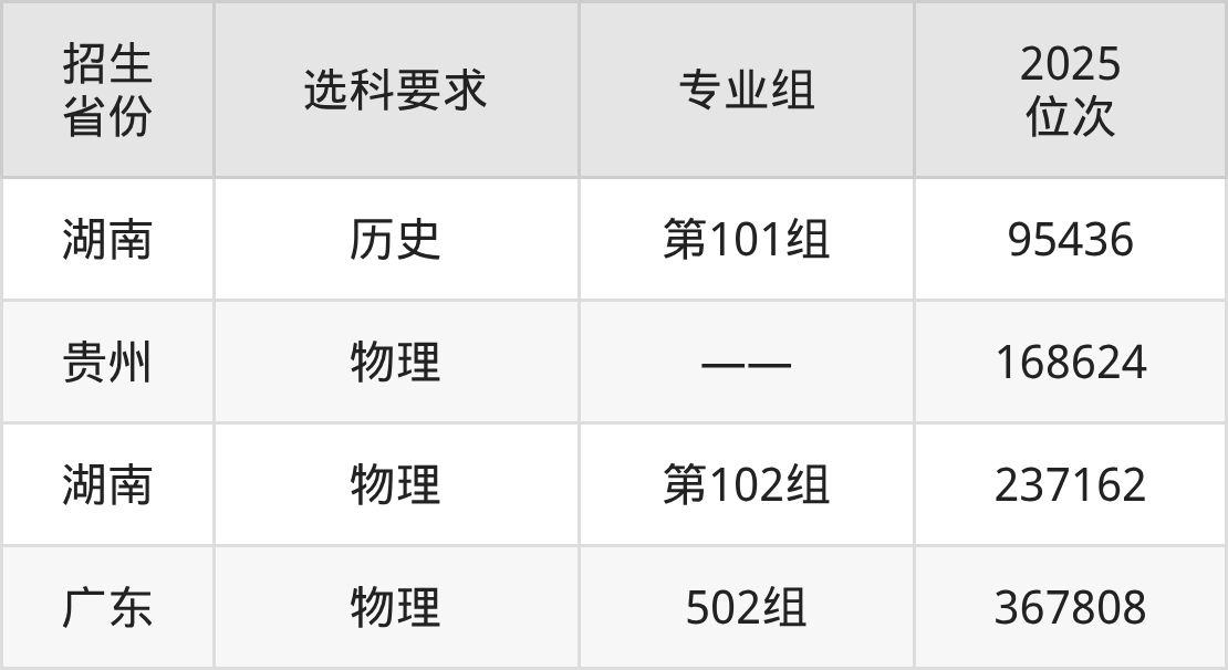 湖南电气职业技术学院2025年在全国各省的位次差异较大,最高位次是95436位(湖南历史类)、最低位次是367808位(广东物理类)。各省具体位次请看下图: