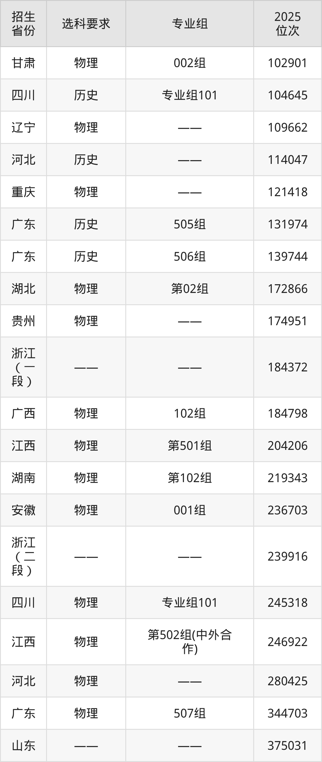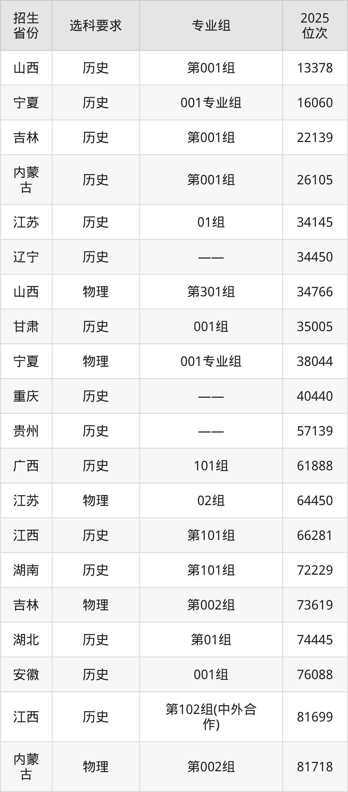 江西交通职业技术学院2025年在全国各省的位次差异较大,最高位次是13378位(山西历史类)、最低位次是386440位(广东物理类)。各省具体位次请看下图:
