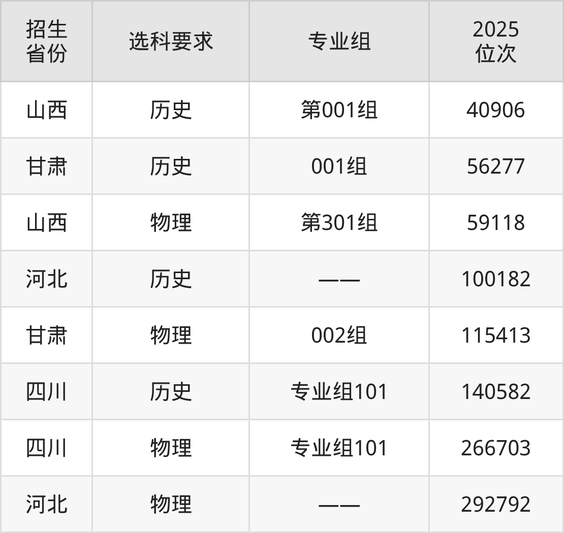 山西国际商务职业学院2025年在全国各省的位次差异较大,最高位次是40906位(山西历史类)、最低位次是292792位(河北物理类)。各省具体位次请看下图: