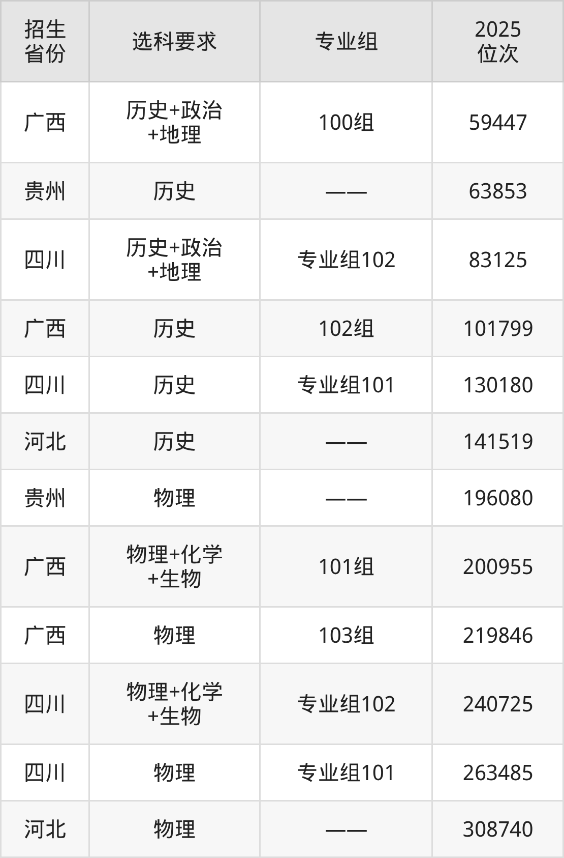 云南特殊教育职业学院2025年在全国各省的位次差异较大,最高位次是59447位(广西历史类)、最低位次是308740位(河北物理类)。各省具体位次请看下图:
