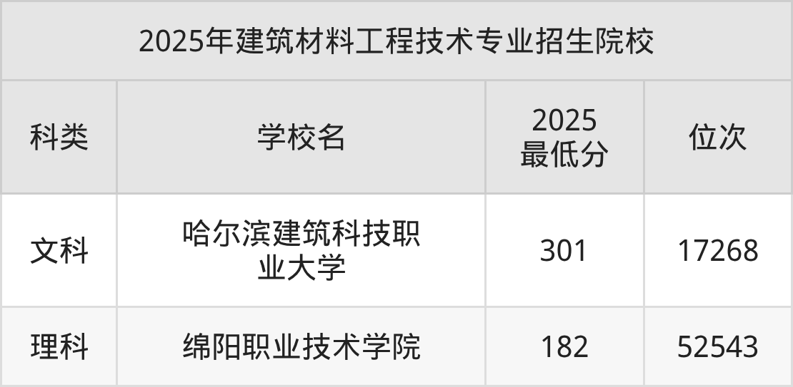 数据显示,建筑材料工程技术最好大学的收分在182分及以上,其中哈尔滨建筑科技职业大学最低分达到了301分,对应最低位次为17268名。