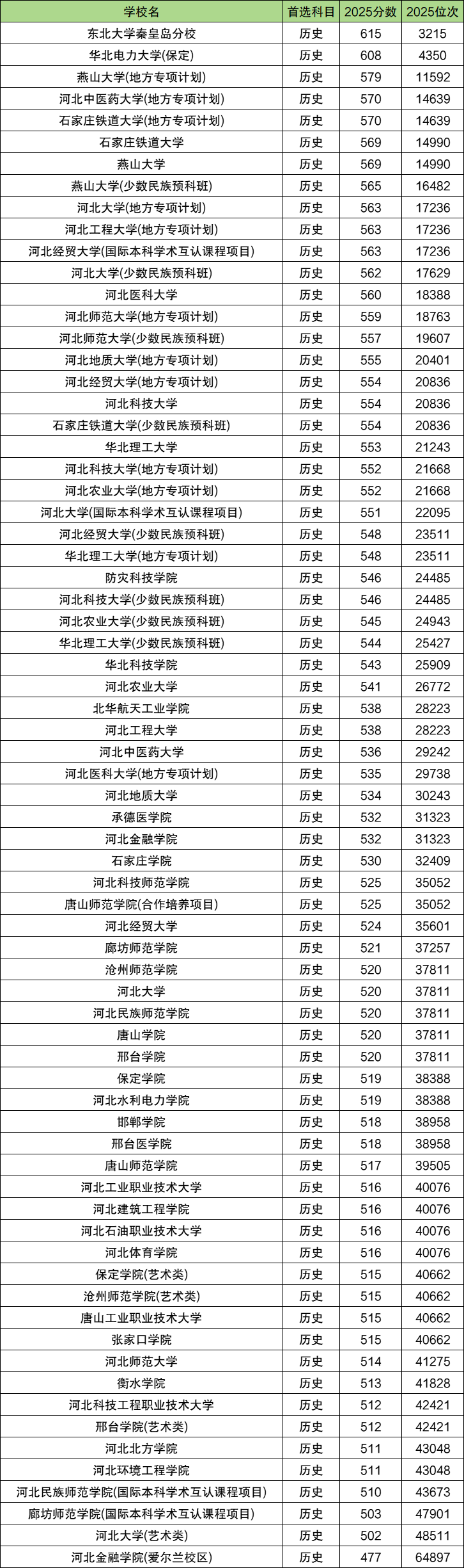 2025年河北公办本科大学在历史组录取分数线范围是477分到615分,下面分别介绍最好考和最难考的公办本科学校名单。
