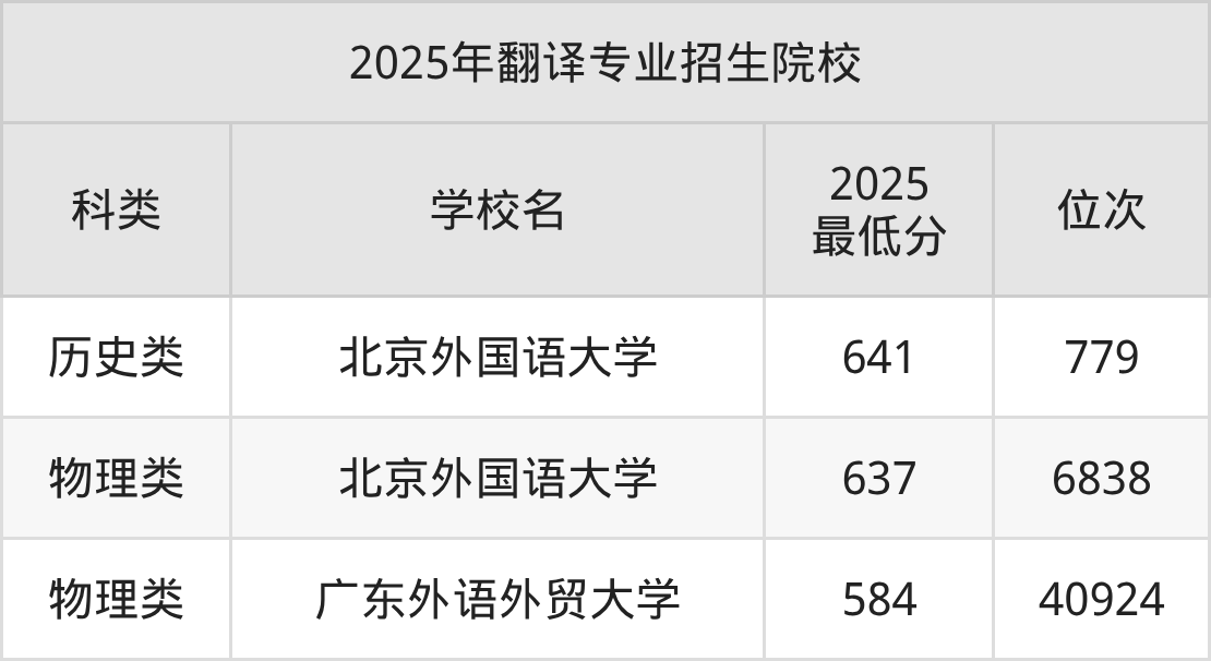 数据显示,翻译最好大学的收分在584分及以上,其中北京外国语大学(外交外事高级翻译)最低分达到了641分,对应最低位次为779名。