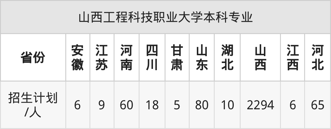 山西工程科技职业大学面向安徽(6人)、江苏(9人)、河南(60人)、四川(18人)、山西(2294人)、江西(6人)、河北(65人)等10个地区开展本科招生。其中四川招生批次为本科批B段,其余省份为本科批。