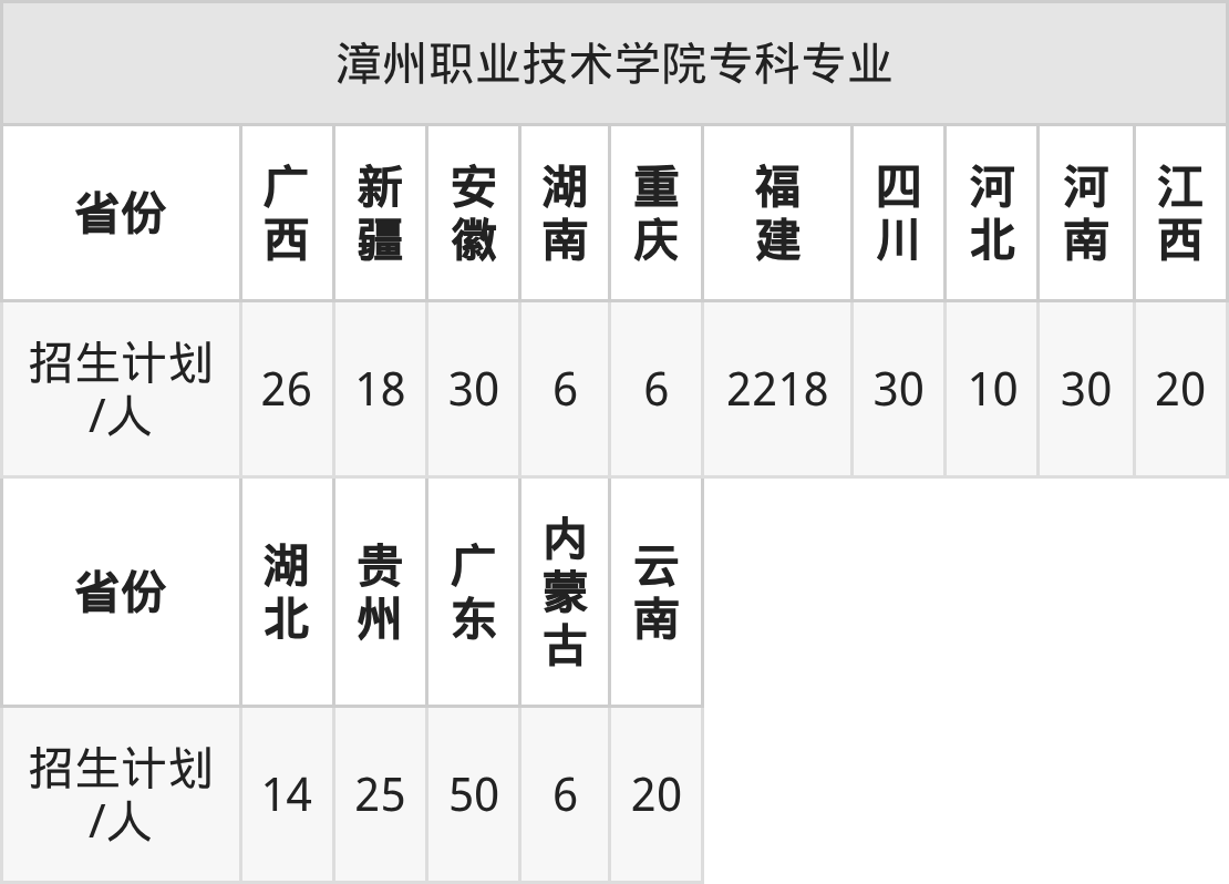 漳州职业技术学院面向江西(20人)、四川(30人)、广西(26人)、河北(10人)、河南(30人)、内蒙古(6人)、重庆(6人)等15个地区开展专科招生。招生批次为专科批。