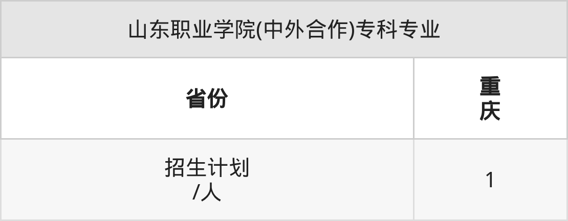 山东职业学院(中外合作)面向重庆(1人)开展专科招生。招生批次为专科批。