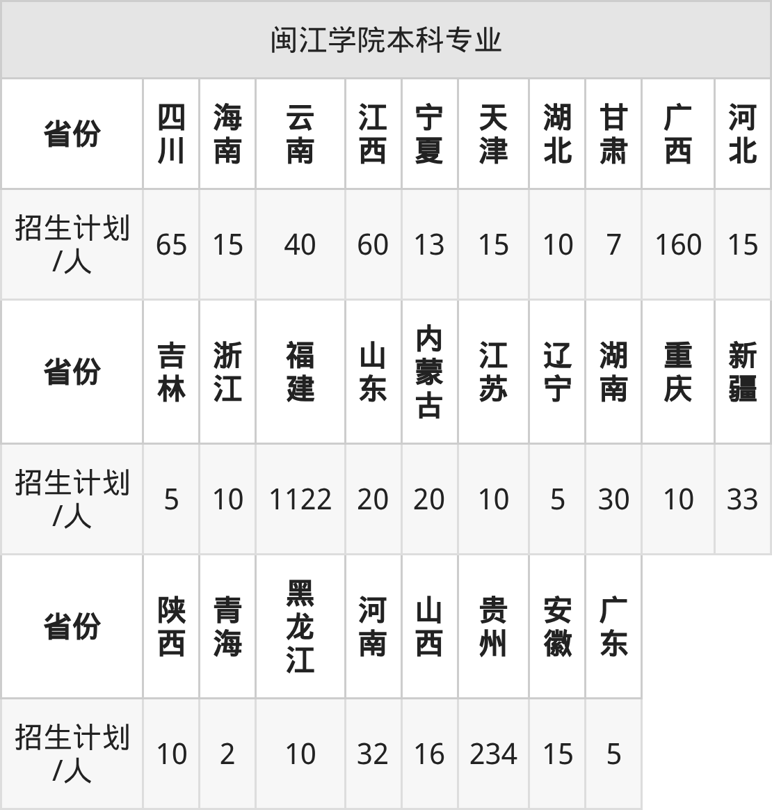 闽江学院面向重庆(10人)、新疆(33人)、吉林(5人)、广东(5人)、黑龙江(10人)、河南(32人)、山西(16人)等28个地区开展本科招生。其中山东招生批次为一段,四川、云南、宁夏招生批次为本科批B段,其余省份为本科批。