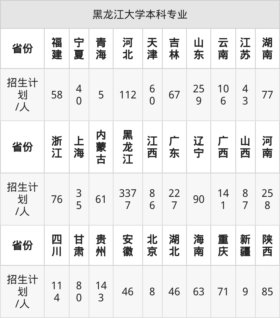 黑龙江大学面向河北(112人)、福建(58人)、北京(8人)、陕西(85人)、云南(106人)、江西(86人)、重庆(71人)等30个地区开展本科招生。其中天津招生批次为本科批A段,四川、宁夏、云南招生批次为本科批B段,其余省份为本科批。